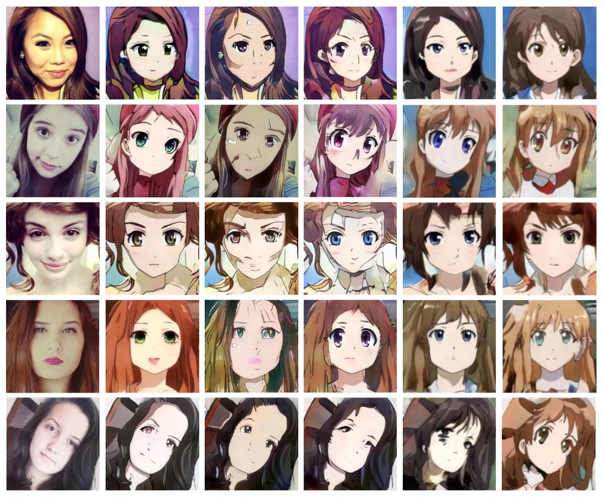 На изображении выше показаны результаты работы U-GAT-IT. В первом столбце исходные селфи, во втором аниме-кадры, сгенерированные в нормальном режиме, далее — выдача U-GAT-IT с различными настройками обработчиков.