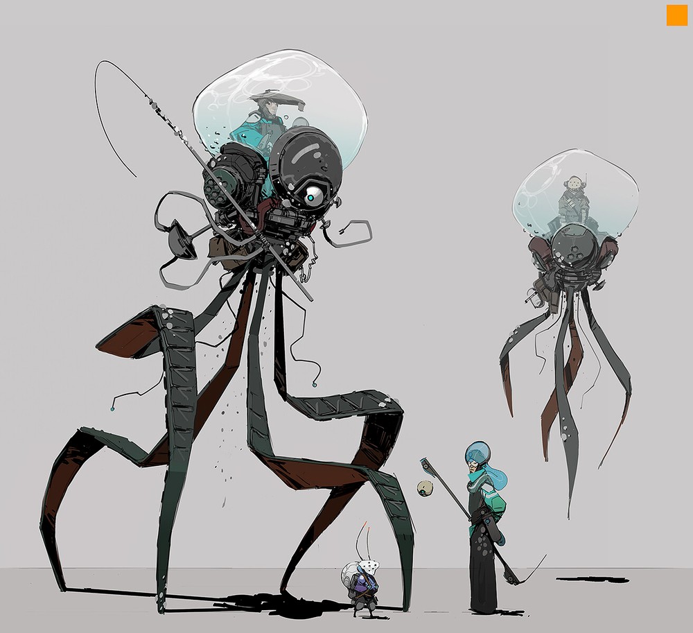 Похожими, но намного более крупными экзоскелетами-мехами в Tribal World управляют пилоты младенческого вида. Взрослым художник дал либо роботов-наездников, либо паукообразных мехов с капсулами-пузырями.