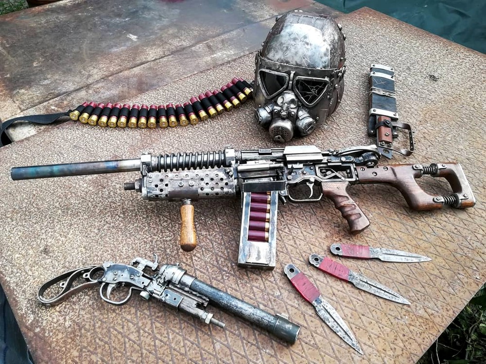 Для косплея Metro Exodus Рудольфс сделал пост-апокалиптический бронекостюм и реплики нескольких игровых пушек. Все они, включая шлем и метательные ножи, изготовлены из металла — никакого пластика, 3D-принтеров или чего-то в этом духе.