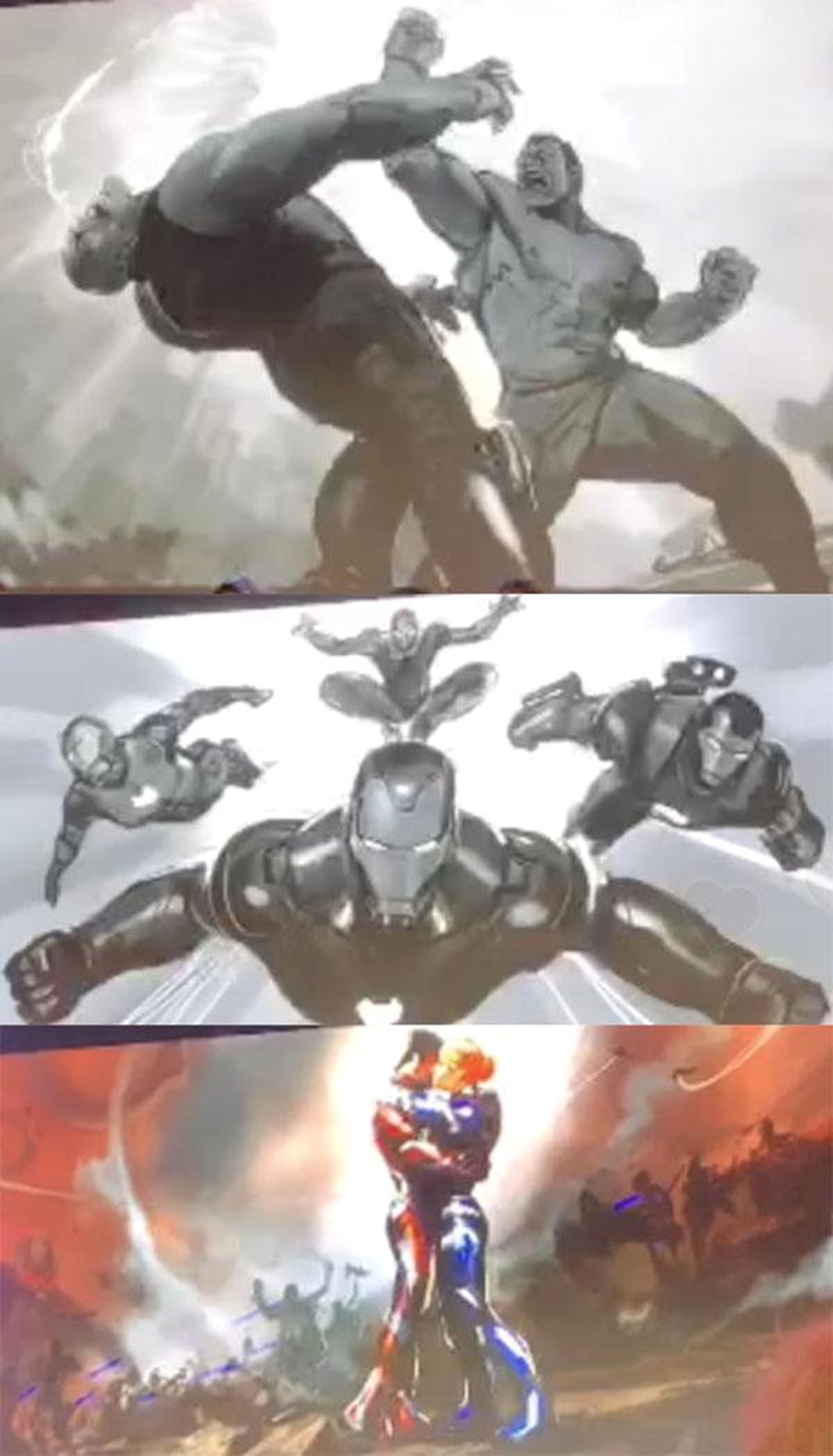 Первый концепт показывает, как Халк мог бы сойтись в поединке с Таносом и отомстить ему за бессилие в «Войне бесконечности». Во второй сцене Тони Старк мог появиться в компании Воителя, Человека-паука и Пеппер в ее новой броне.