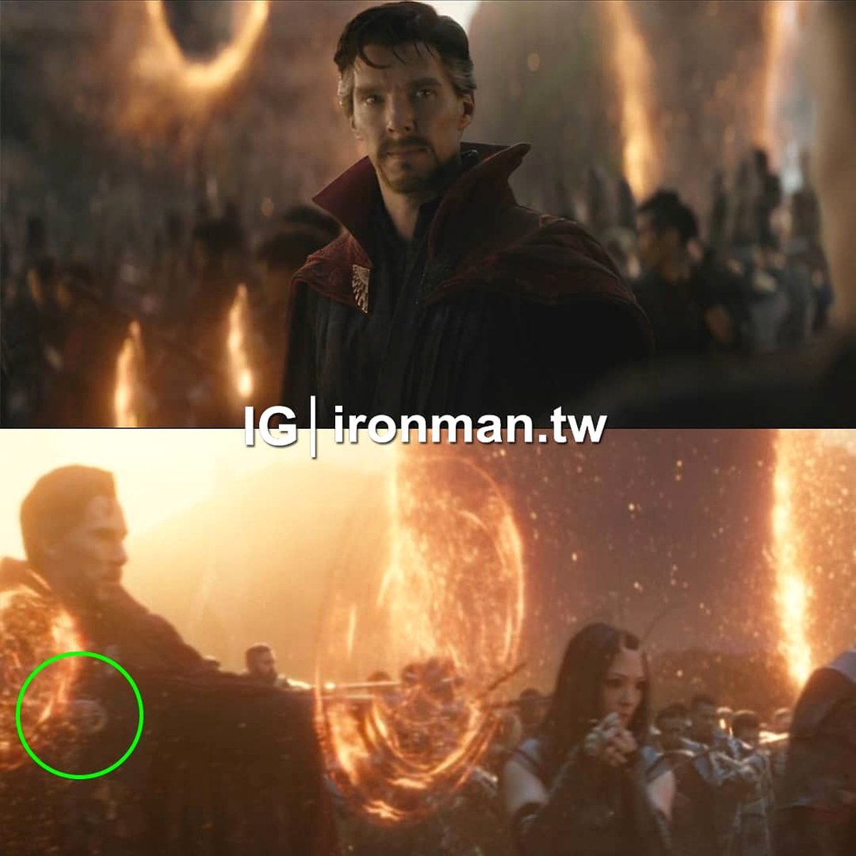 Ошибка могла произойти из-за одновременной съемки «Войны бесконечности» и «Финала». Над сценами фильмов работали параллельно, в какой-то момент костюмеры могли оставить Бенедикту Камбербэтчу предмет, от которого его персонаж уже избавился.