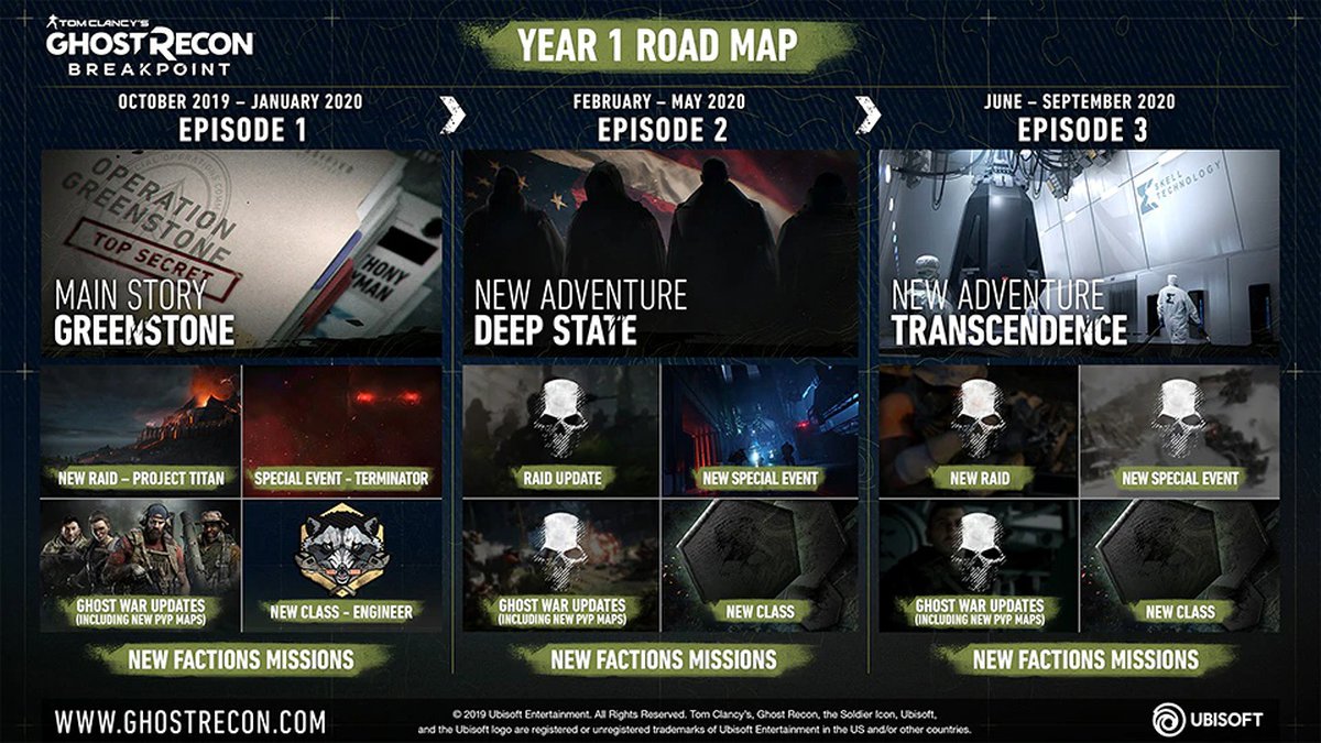 Разработчики планируют ежемесячно вводить в игру сюжетные задания фракций. До конца первого года поддержки в Ghost Recon Breakpoint появятся три новых класса, играбельных как в PvE, так и в PvP.