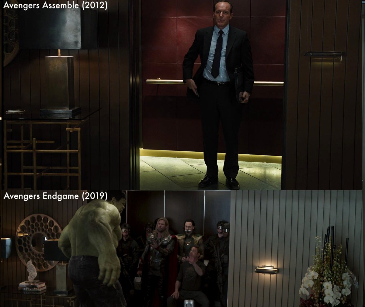 В «Финале» герои, отправившиеся в 2012 год за Камнями Бесконечности, спускаются из пентхауса Тони Старка на его личном лифте. Этот же лифт можно увидеть в первой части «Мстителей» — на нем поднимается Фил Колсон.