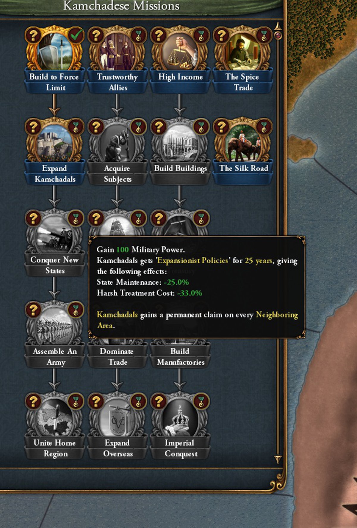 Изменится общее древо миссий, которое доступно странам, не имеющих уникальных квестов. Появится 2 новых задания, будут даваться претензии на соседей в качестве наград, некоторые эффекты переработают таким образом, чтобы давать очки монарха вместо меркантилизма, военных традиций или престижа, если лимит этих показателей превышен. Также будут давать советников со скидкой, адмиралов и не только.