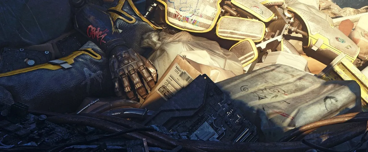 Самое интересное здесь — не свалка, а рекламные баннеры на зданиях Найт-Сити.