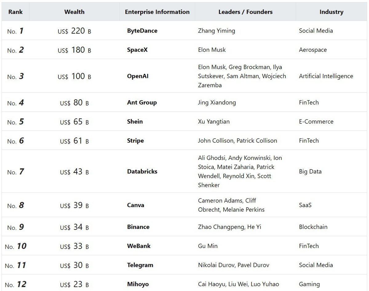 В топ-3 вошли ByteDance, SpaceX и OpenAI.
