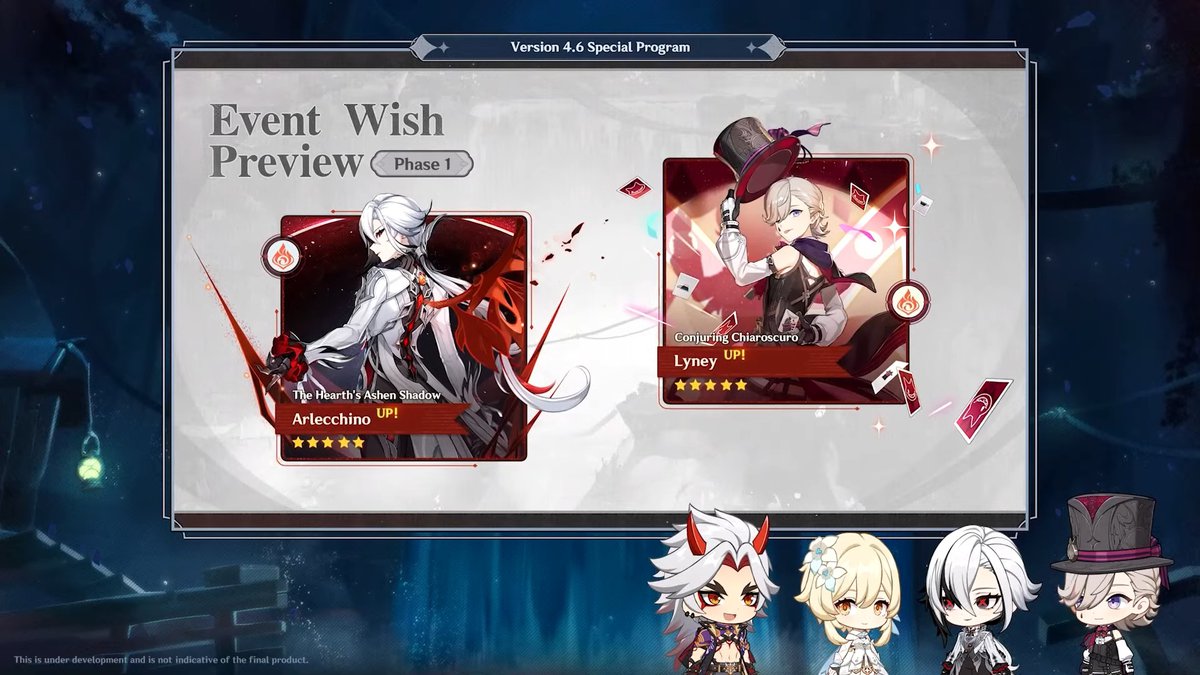 Арлекино, единственный новый персонаж обновления 4.6, появится в первом баннере этого патча. Также готовятся рераны трех персонажей с пятью звездами редкости: Странника, Бай Чжу и Лини.