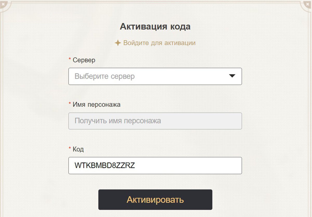 После выбора сервера будет загружен список персонажей, выберите нужного героя, активируйте промокод и персонаж получит бонусы. Если списка персонажей нет, то вы выбрали не тот сервер — попробуйте еще раз.