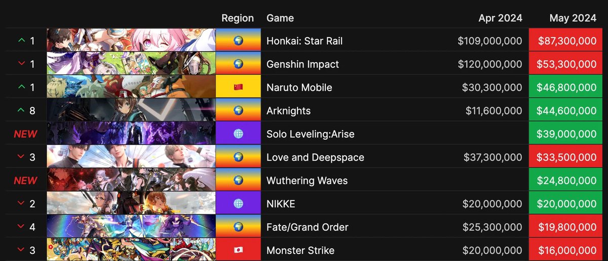 В десятку самых прибыльных мобильных игр мая также попал только что выпущенный проект Wuthering Waves. Это гача-экшен, стилистически и геймплейно сильно напоминающий Genshin Impact; стартовая выручка игры оценивается в $24.8 миллиона.