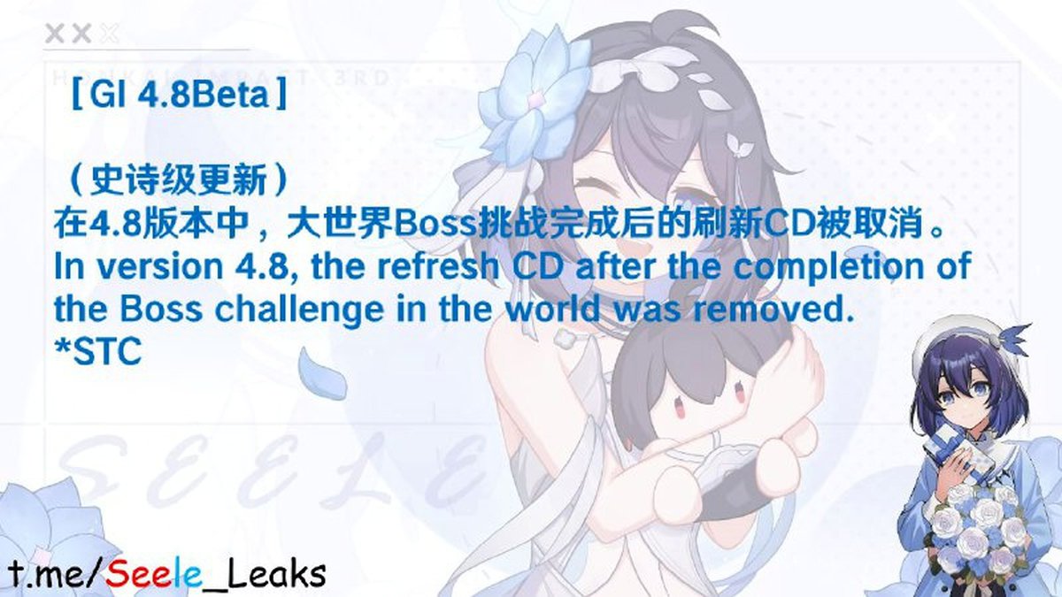 Разработчики Genshin Impact намерены отказаться от кулдауна при респауне боссов, пишет инсайдер Seele. Ожидается, что кулдауны возрождения боссов будут обнулены в обновлении 4.8.