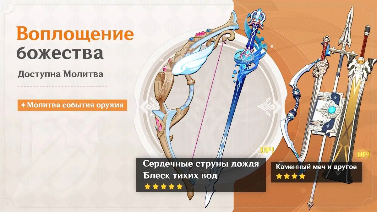 В баннере оружия будут доступны сигнатурный меч Фурины, Блеск тихих вод, и сигнатурный лук Сиджвин, Сердечные струны дождя. Также игроки могут попытаться получить несколько предметов с четырьмя звездами редкости.