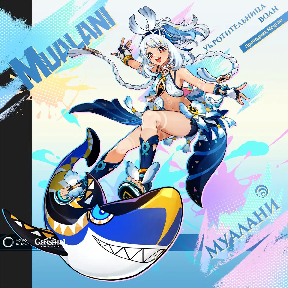 У Муалани 5 звезд редкости и элемент гидро. Это та самая девушка, что гоняла в тизере на зубастой акуле: Муалани происходит из Народа Родников и прекрасно знает все уголки Натлана.