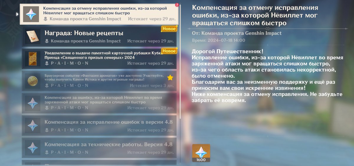 Студия miHoYo начала раздавать игрокам в Genshin Impact компенсацию за исправление ошибки Невиллета. Игроки, прокачавшиеся хотя бы до 5 ранга приключений, получат по 1600 Камней истока.