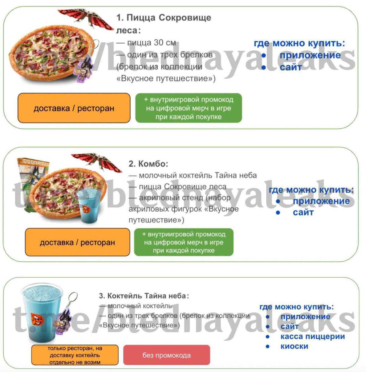 - Комбо: молочный коктейль Тайна неба и пицца Сокровище леса. За покупку выдается набор акриловых фигурок Вкусное путешествие и внутриигровой промокод «на цифровой мерч».