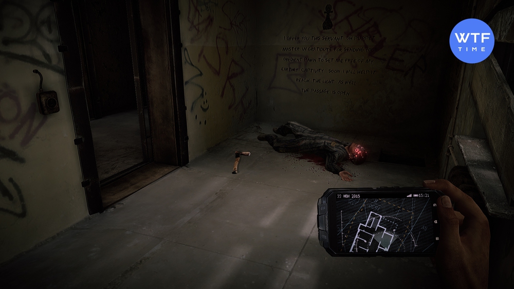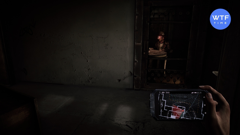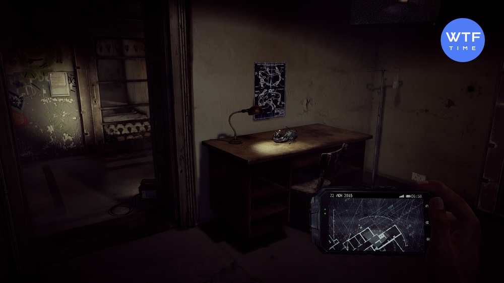 - После переноса в новый отрывок памяти, вы должны будете подобрать пистолет со стола. Сразу за открывшейся дверью вы увидите стол, на котором лежит устройство Пандора. Его нужно отсканировать, а плакат над ним - прочитать.