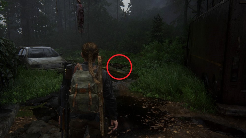 За легковой машиной слева от подвешенного трупа с предыдущего скриншота.