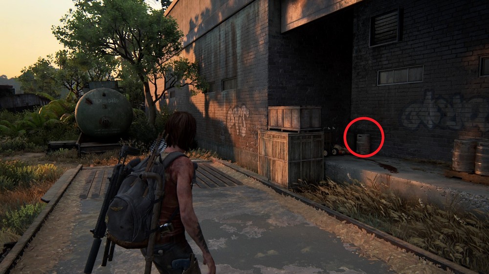 Двигайтесь по сюжету до места, откуда Элли смотрит на группу конвоируемых пленников издалека. Слева от вас будет кирпичное здание. Записка лежит на бочке за деревянными ящиками, к ней ведет кровавый след.