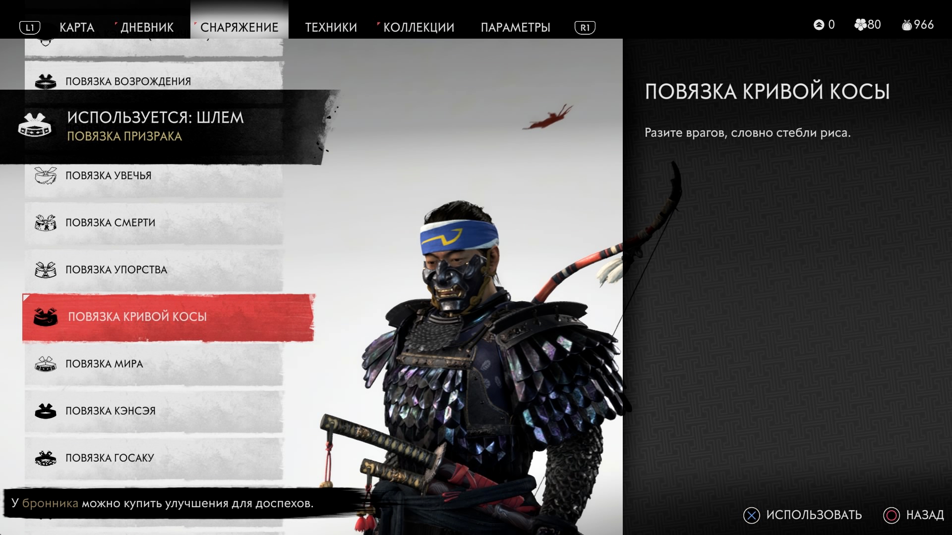 Забравшись на вершину храма в Дзёгаку, вы найдёте «Повязку кривой косы». Чтобы это сделать, цепляйтесь за углы крыши при помощи крюка.