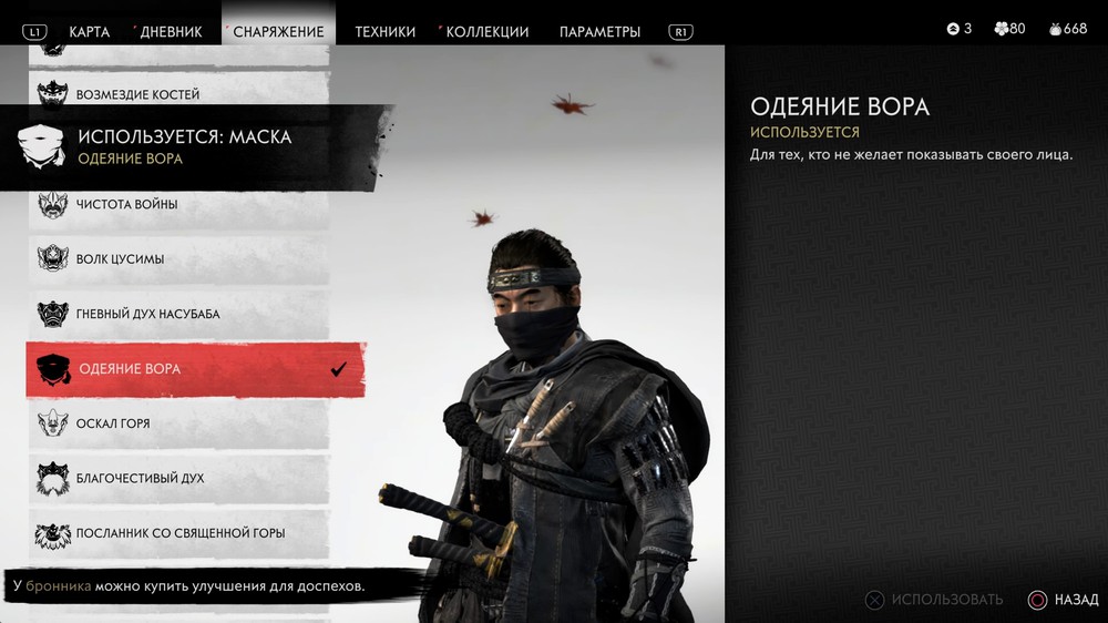 Последний необходимый предмет называется «Одеяние вора». Эту маску вы сможете забрать с алтаря для даров по мере вашего продвижения по сюжету. Такой алтарь есть, к примеру, в Храме Дзёгаку.