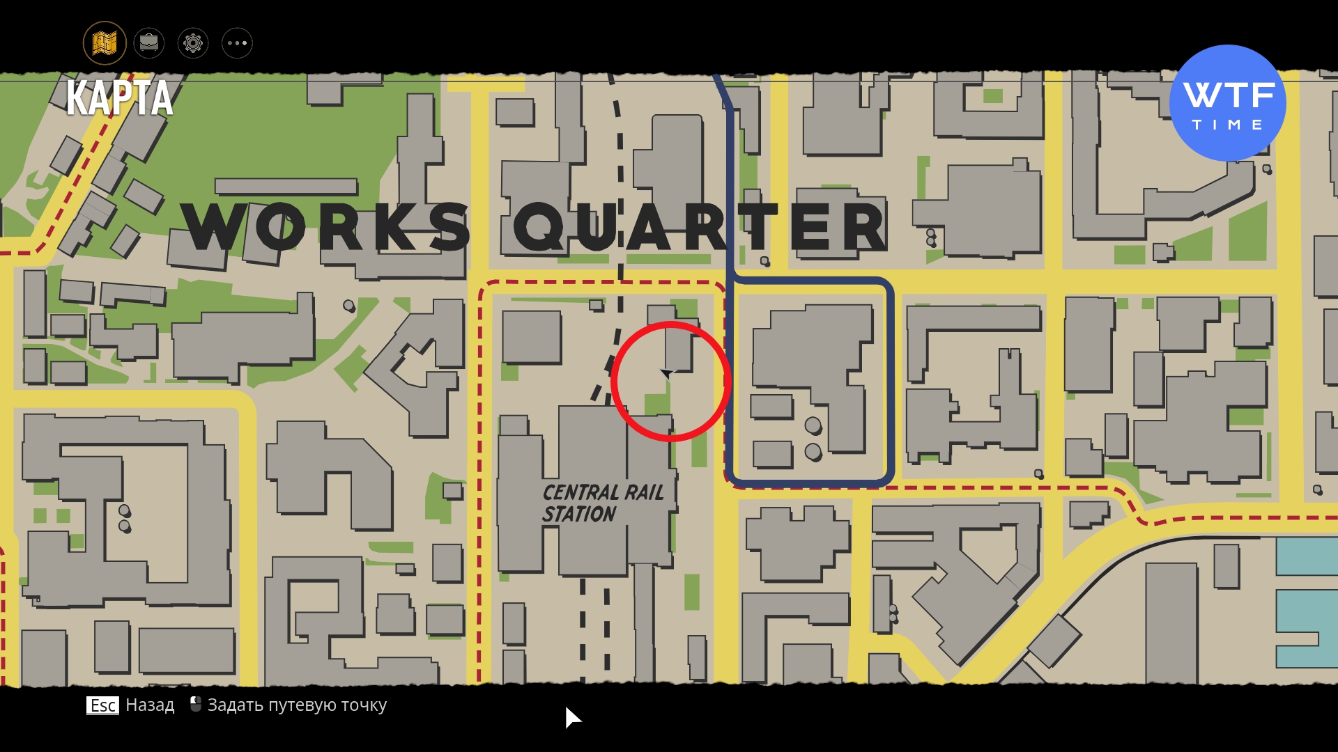 Район Works Quarter расположен в юго-западном углу карты. В точке, отмеченной на карте ниже, вы найдете кучу ящиков. Перелезьте по ним через забор, а затем пройдите по лабиринту из ящиков до конца.