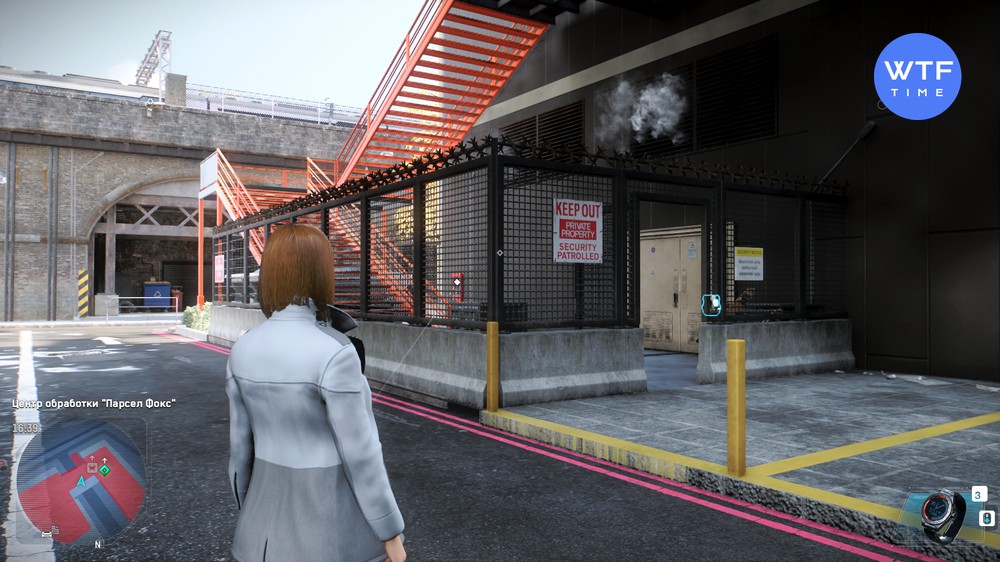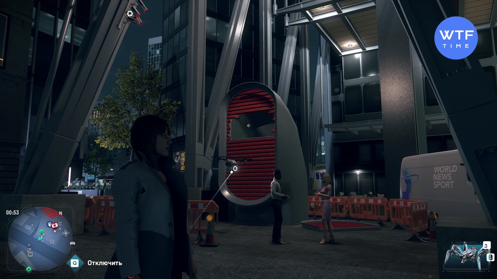 - Сбор фотоулик - возле белого фургона World News Sport перед входом в здание стоят два журналиста. Взломайте дрон, который висит прямо над ними и летите в дыру внутри красной конструкции. Когда доберетесь до места - переключите вид и сделайте фото.