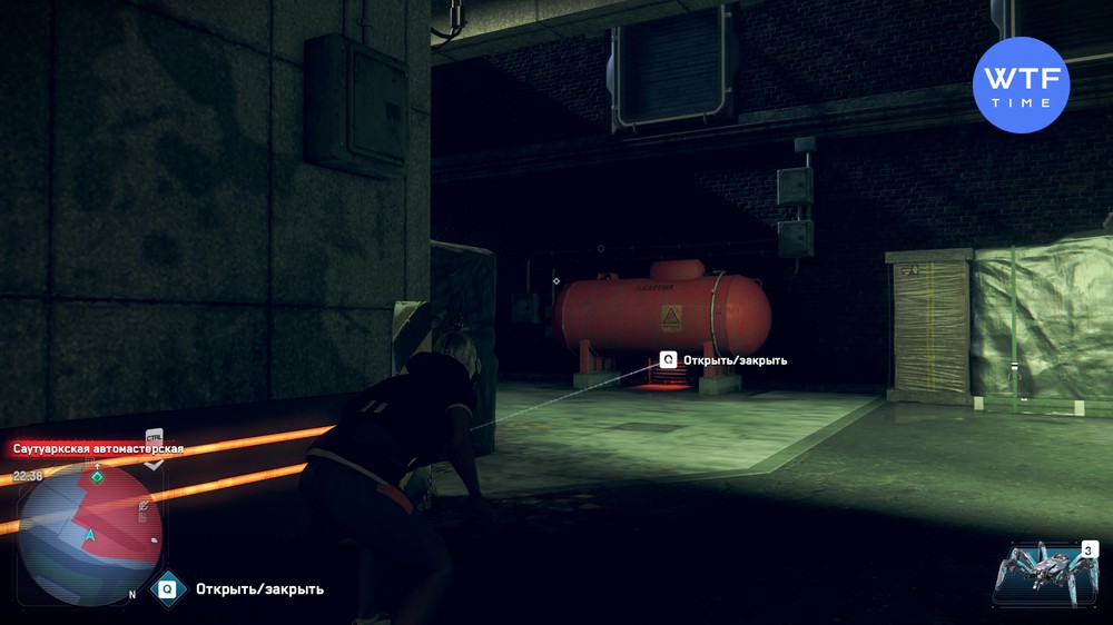 - Диверсия - эту задачу удобно выполнять при помощи бота-паука. Его можно запустить в автомастерскую через отверстие в стене под красной цистерной.
