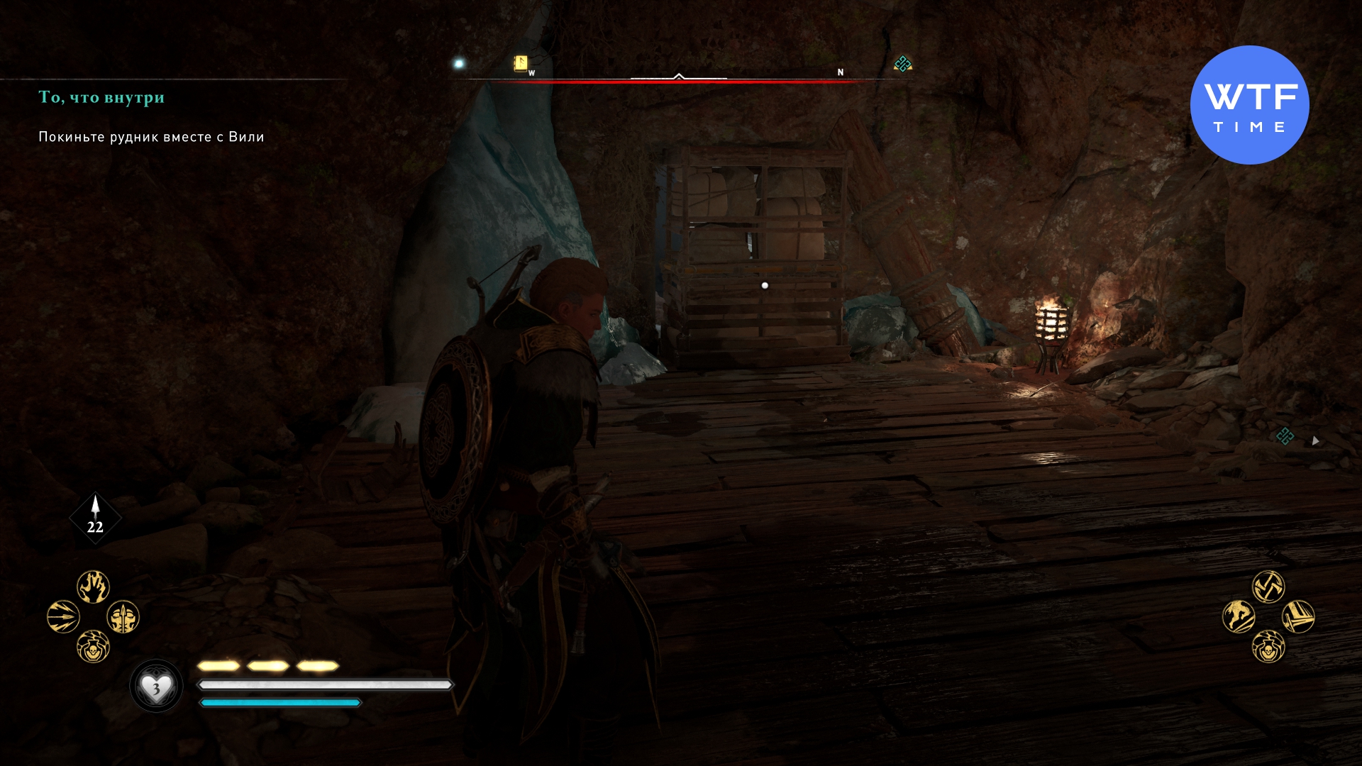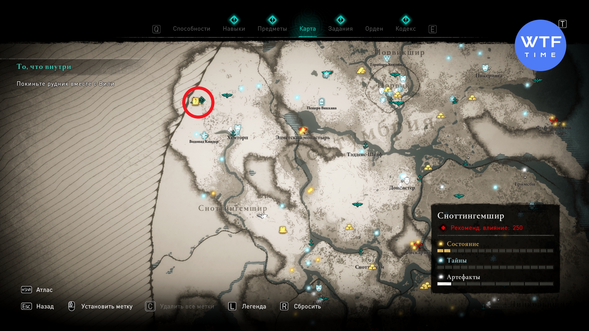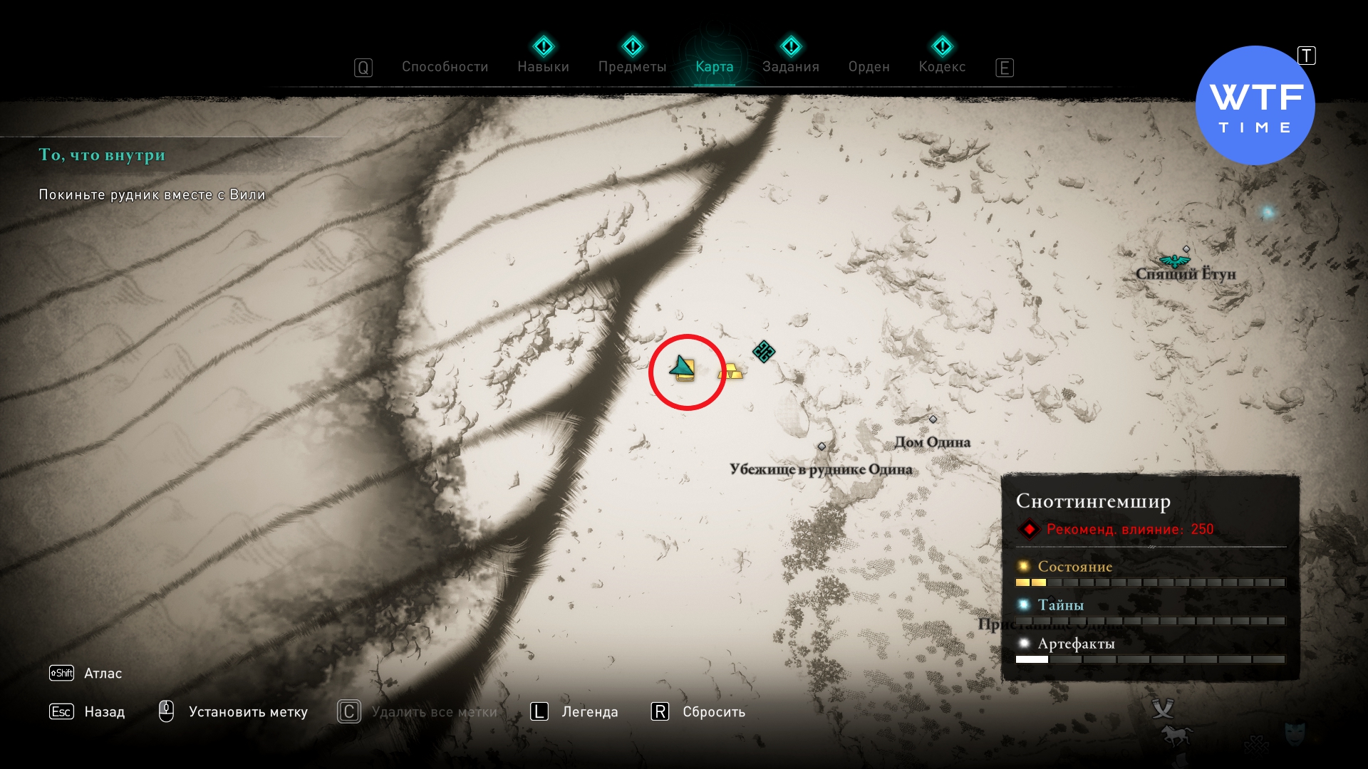 Убежище в руднике Одина находится в северо-западной части Сноттингемшира. Вы отправитесь туда с Вили по сюжету. В главной части вражеского лагеря (где сундук со слитком стоит на высокой круглой деревянной платформе в центре) у стены пещеры можно сдвинуть стеллаж с ящиками.