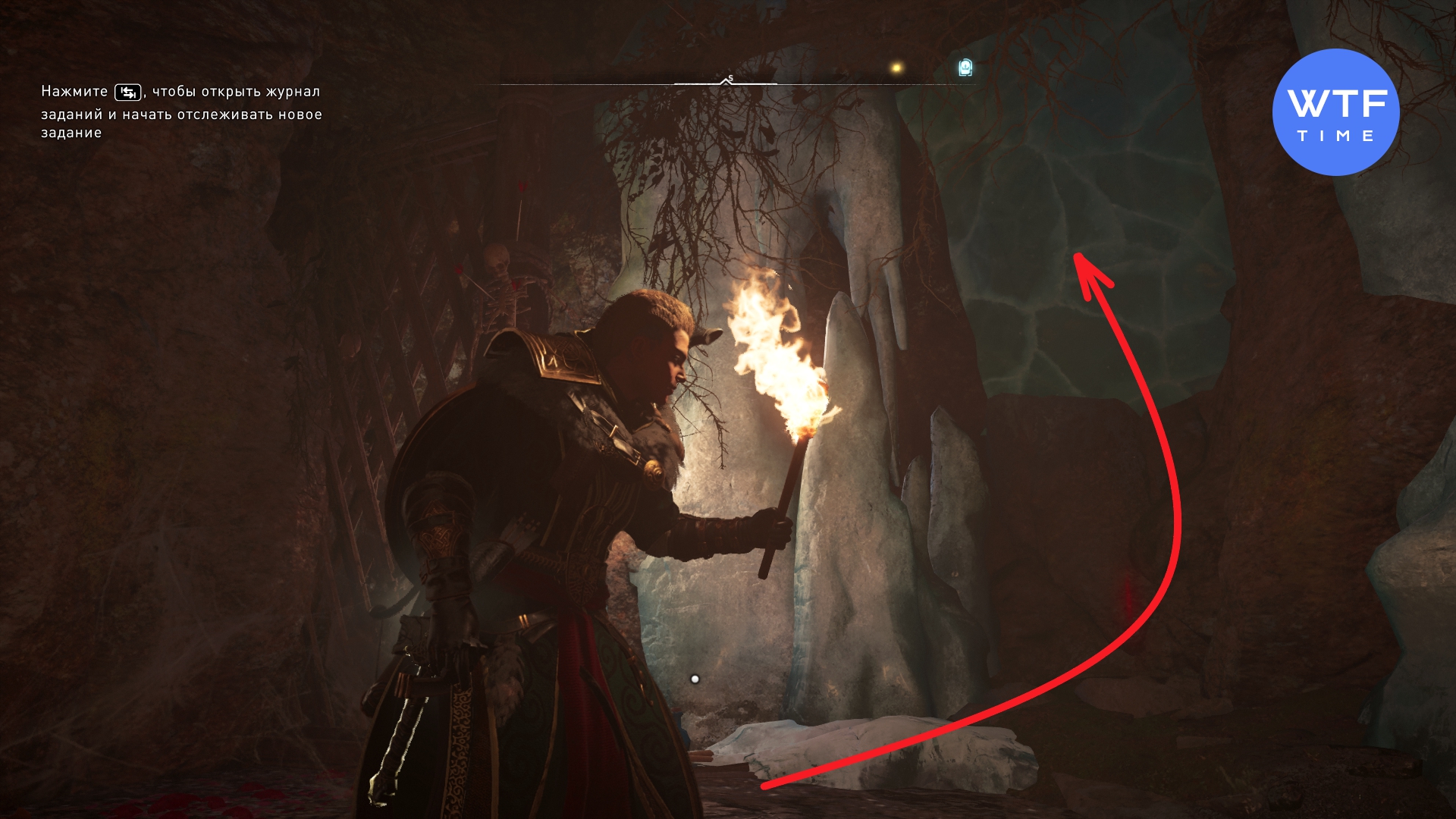 Принцип поисков будет такой же: ключи подвешены на веревках и вам нужно отыскать такую точку, откуда можно до них допрыгнуть. После этого идите в самую нижнюю часть пещеры (где светится сундук со слитком) и прочитайте следующее указание: