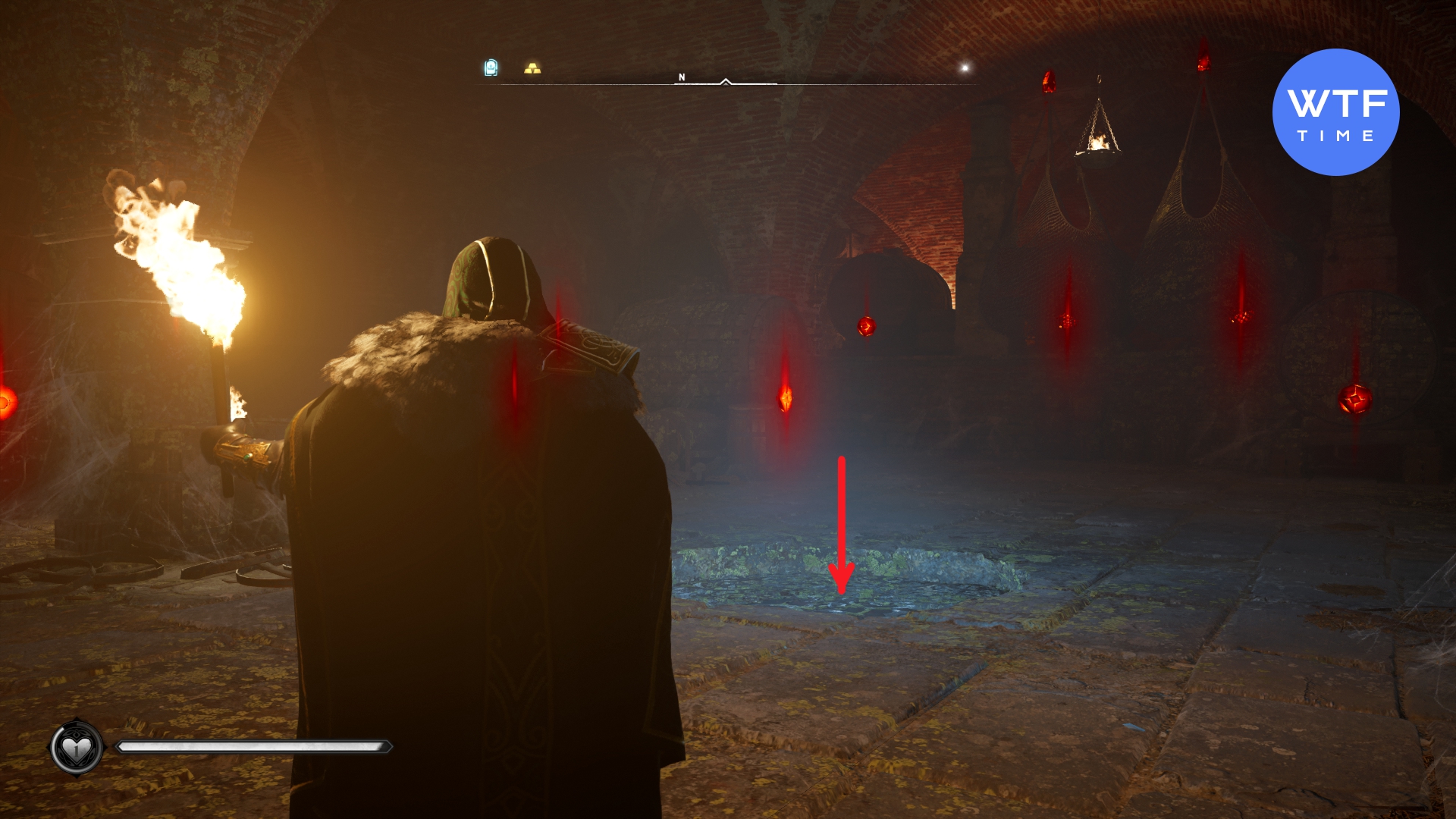 Загадочная табличка лежит внутри колодца под решеткой в центре погреба. Вам нужно сбить вентили на достаточном количестве бочек, чтобы они наполнили колодец и табличка всплыла.