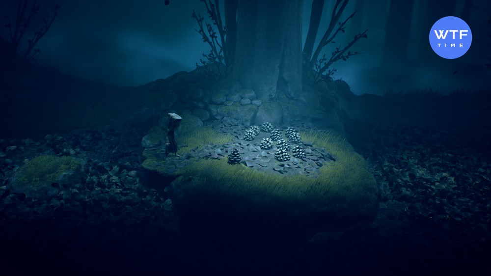 После этого вернитесь назад и используйте палку, чтобы обезвредить ловушки под листьями. Доберитесь до камня, а с него прыгайте к куче шишек. Кидайте их в листья перед вами, чтобы расчистить дальнейший путь.