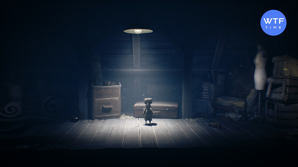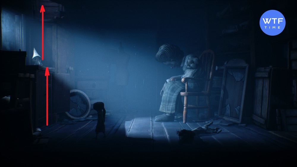 Шестая побежит наверх, в комнату напротив той, где мы подобрали предыдущую шапку. Вам нужно идти за ней. Вы окажетесь в комнате, где за столом сидят страшные чучела. Заберитесь по полкам комода в окно справа.