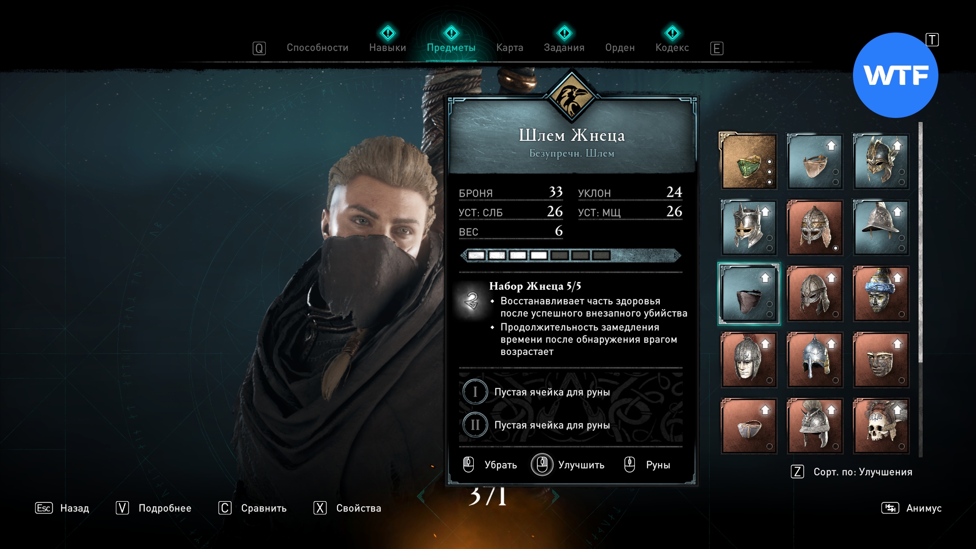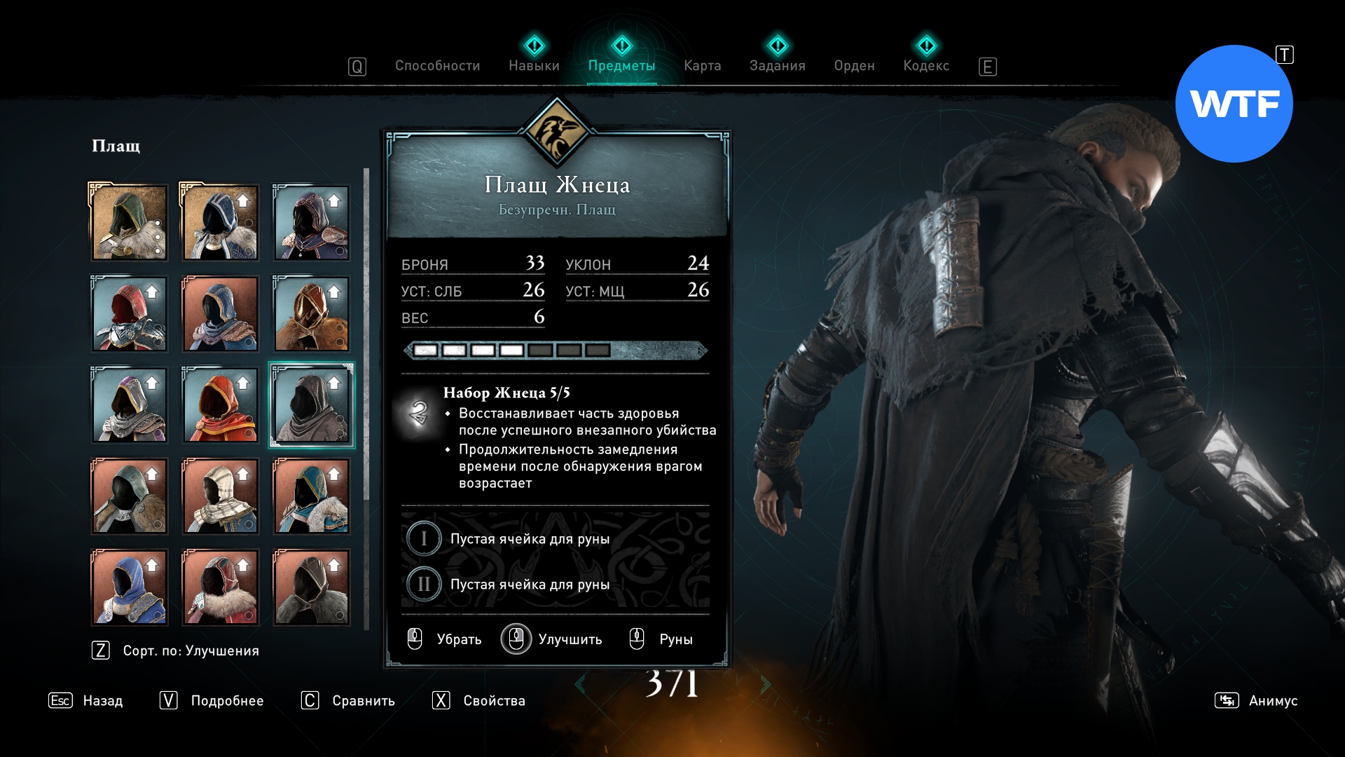 - 3 уровень - Плащ и Шлем Жнеца (покупаются) + Перчатки Жнеца (даются Пьером);