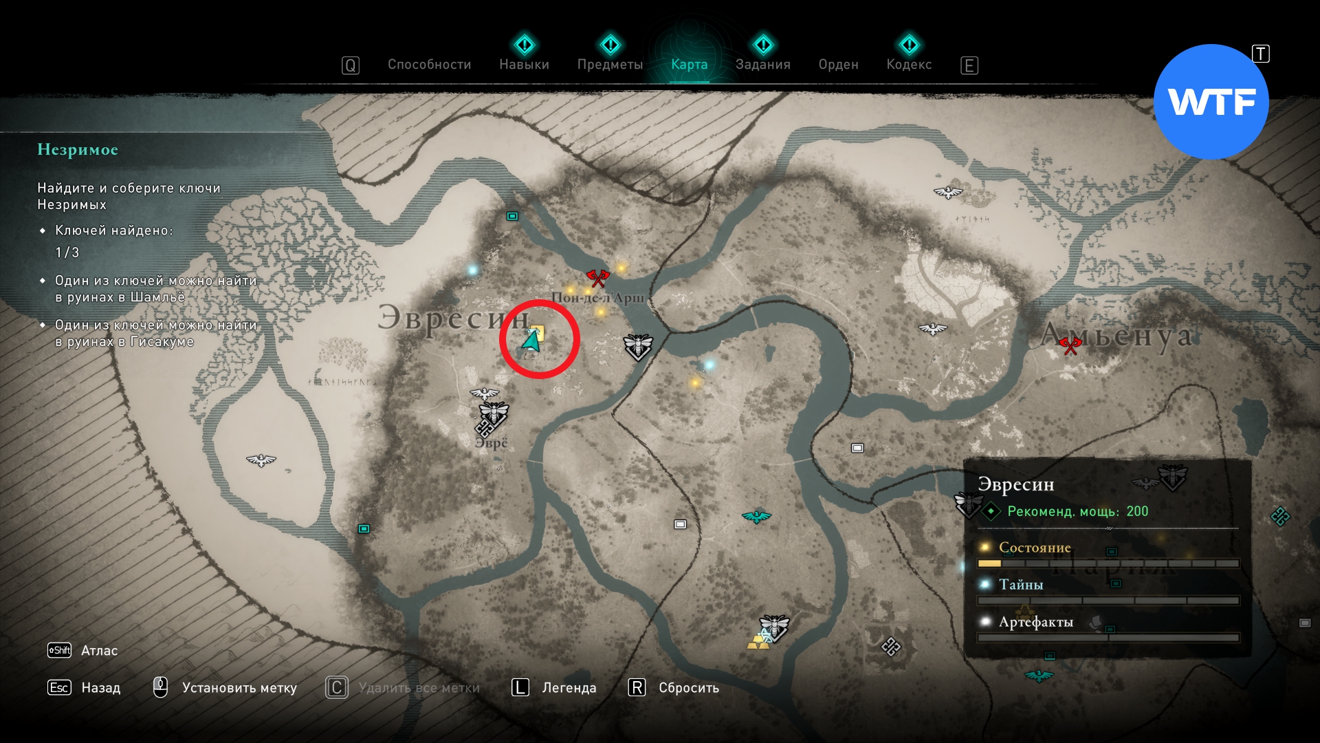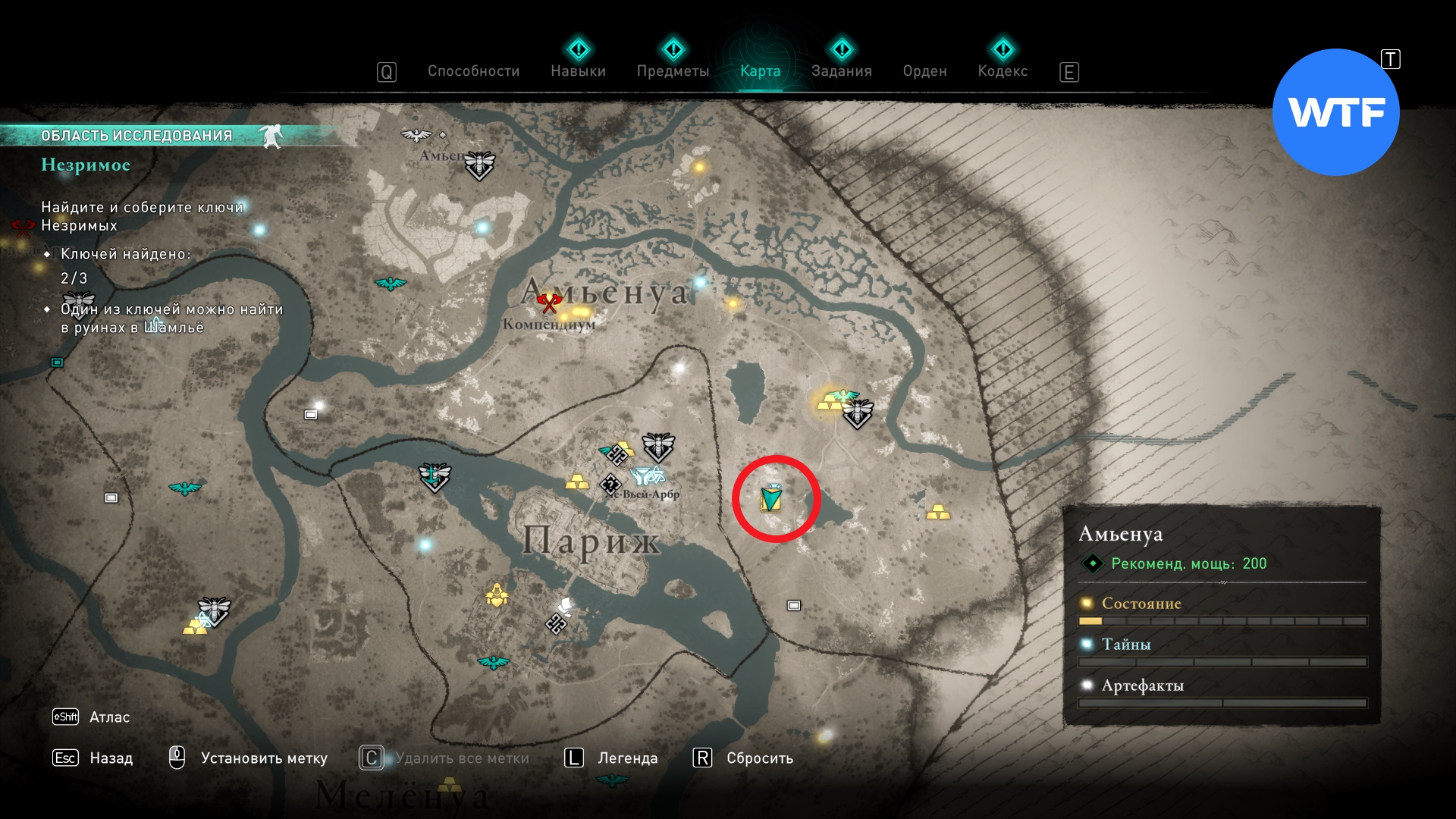 Чтобы добраться до сундука, нужно принести с собой три ключа. Вы найдете их на Раскопках римских руин. Все три места отмечены специальными значками и показаны на картах ниже. Как только вы обнаружите первый ключ - получите квест "Незримое", который и приведет вас в контору в Лютеции.