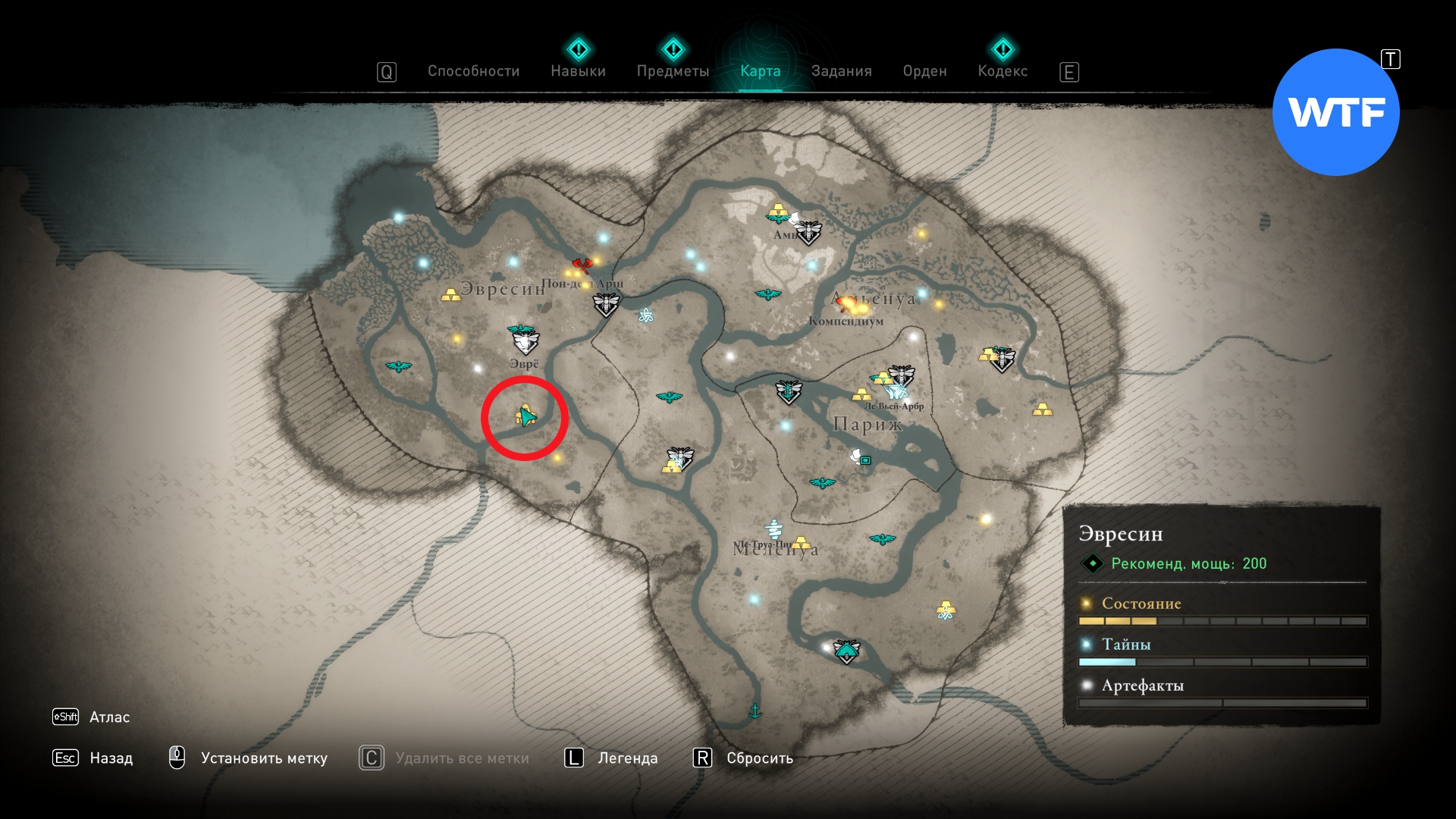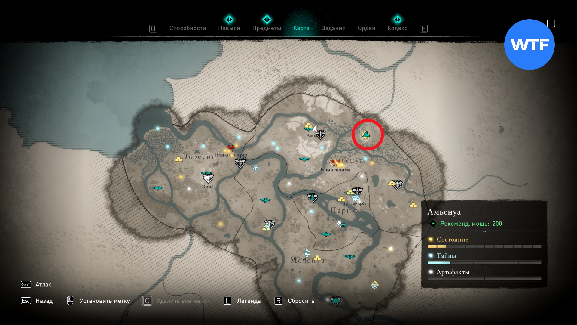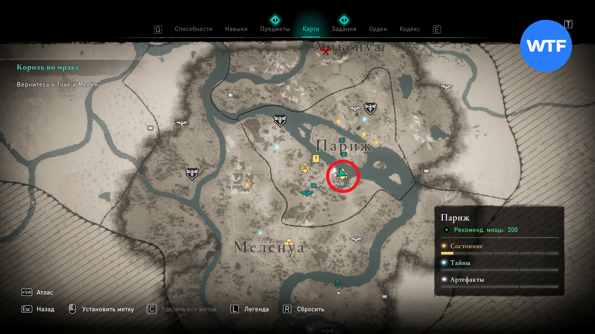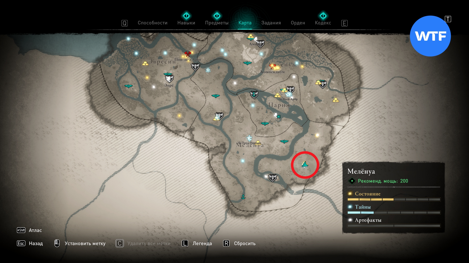 Отправляйтесь в Затопленные трущобы Парижа. Чтобы добраться до сундука, вам нужно отыскать небольшой склеп в 15 метрах к югу от метки сокровища (см. скриншот 3). Внутри него есть спуск вниз, который в итоге и приведет вас к сундуку с косой.