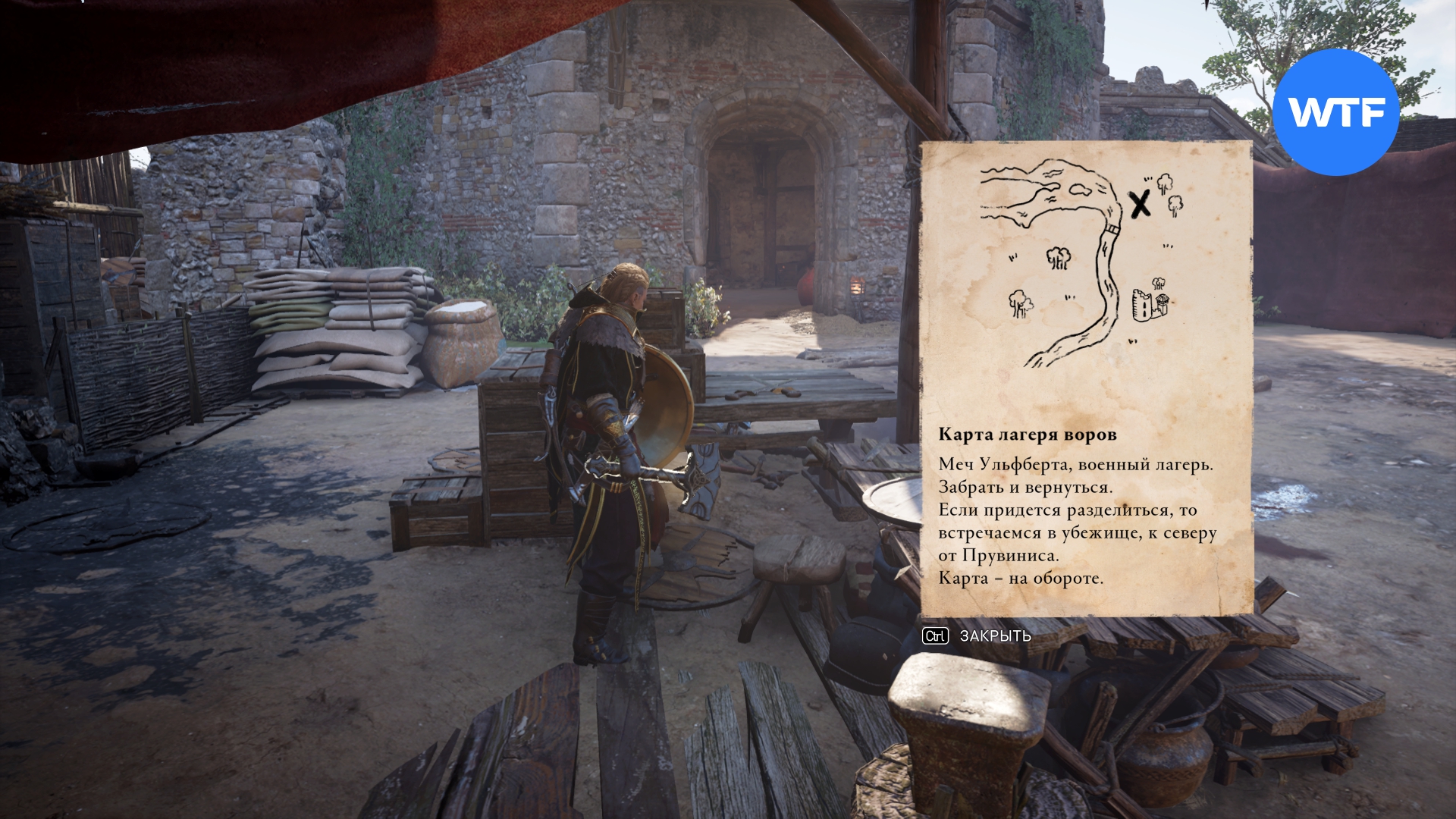 Отправляйтесь в Прувинис в восточной части региона Мелёнуа (см. скриншот 2). Местный значок тайны приведет вас к Карте лагеря воров вот с таким текстом: "Меч Ульфберта, военный лагерь. Забрать и вернуться. Если придется разделиться, то встречаемся в убежище, к северу от Прувиниса. Карта - на обороте."