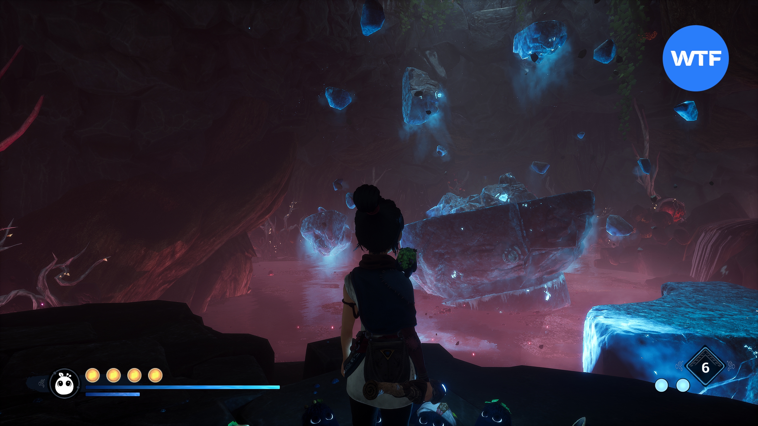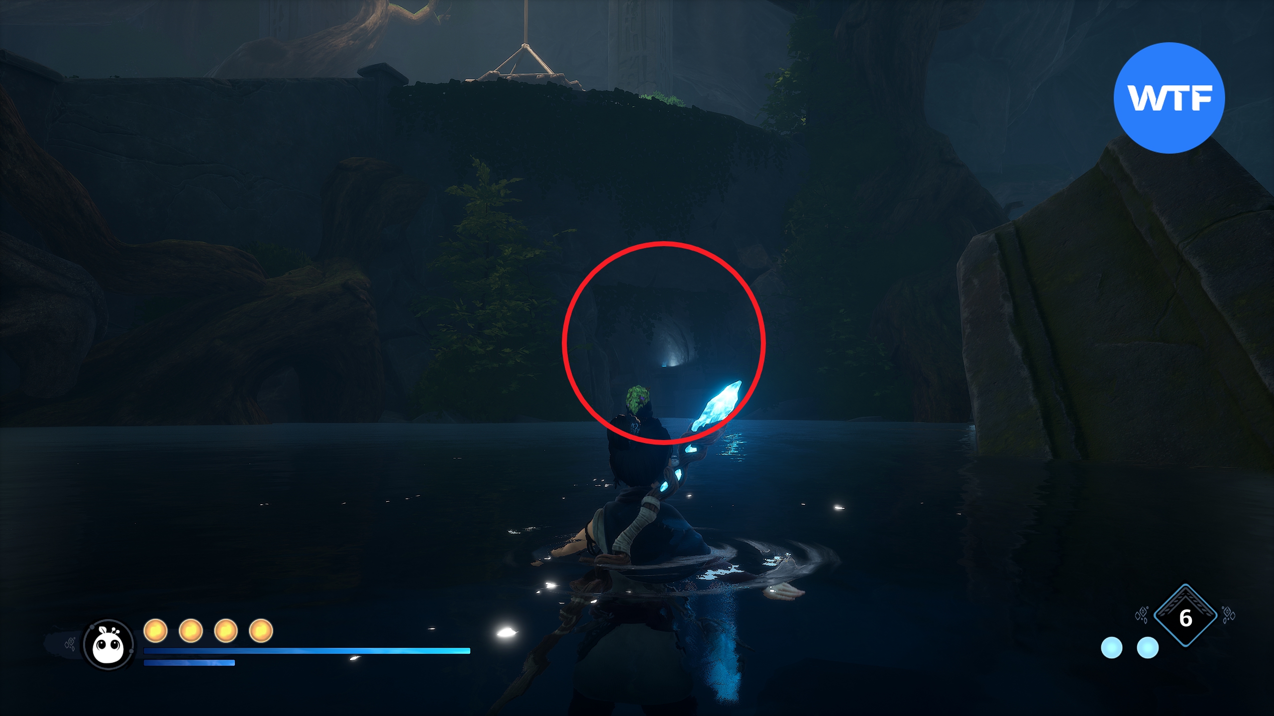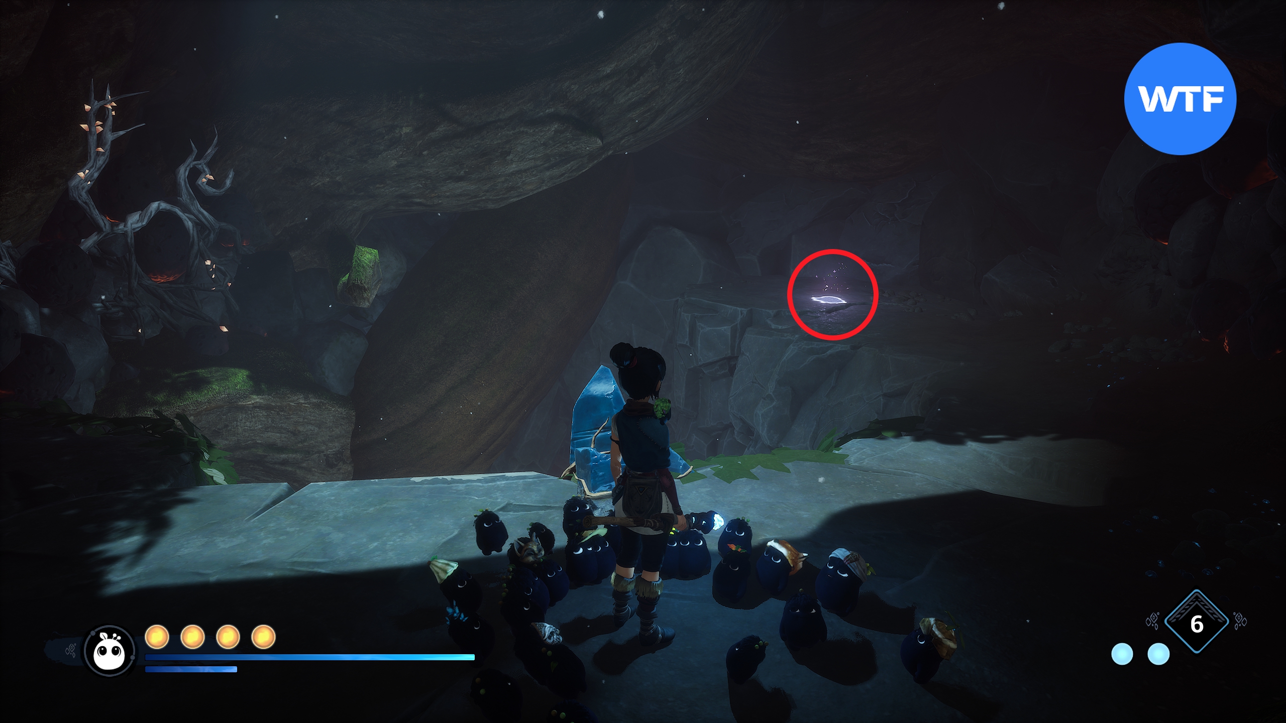 Продолжайте идти по сюжету до следующей пещеры с камнями, которые нужно поднять в воздух (показаны на скрине ниже). Заберитесь по ним до самого верха, а затем посмотрите налево, чтобы найти лужицу с тленышем.