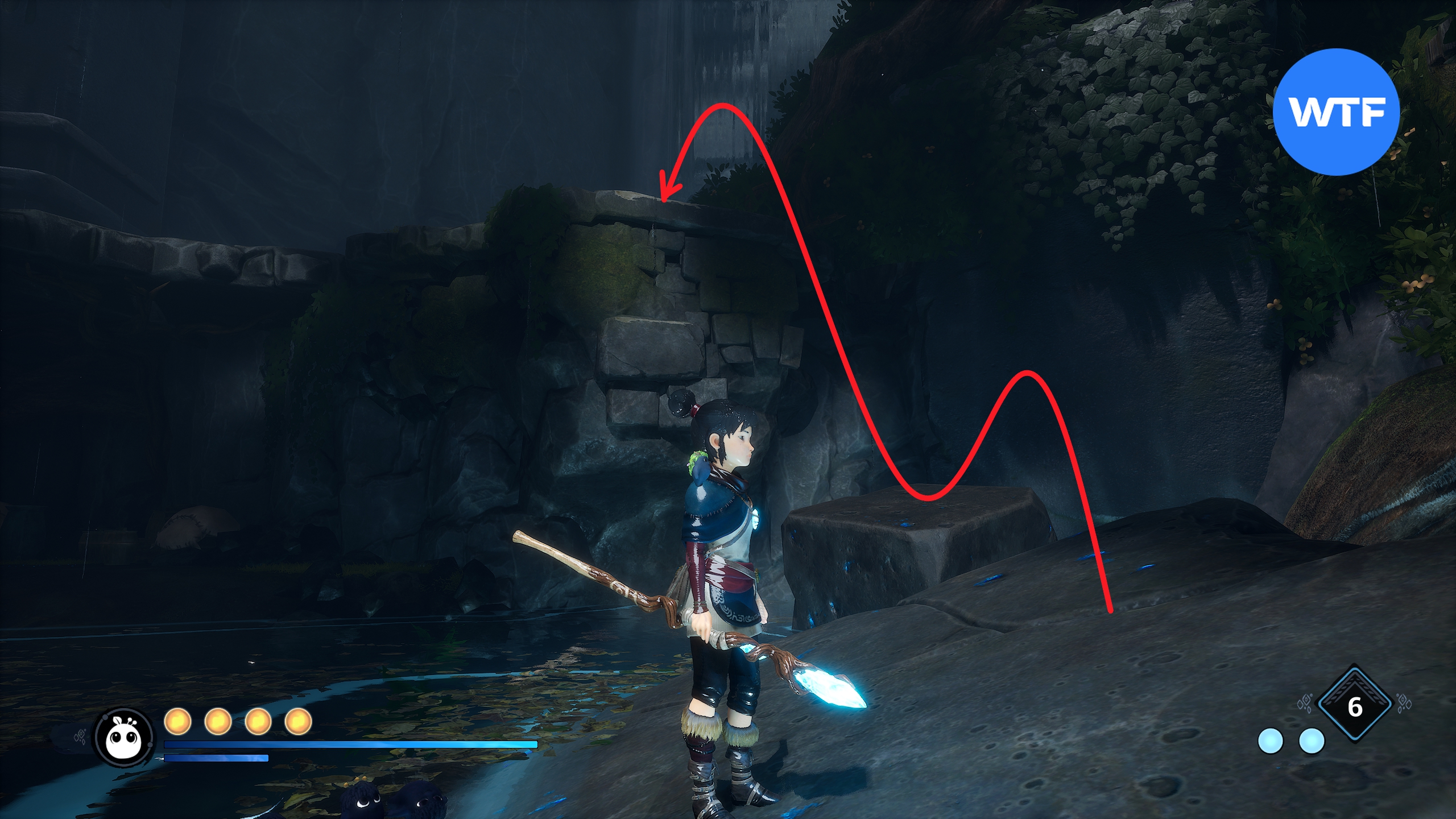 Вернитесь к камням и снова на них залезьте. Слева есть уступ, до которого вы можете допрыгнуть. Сделайте это и увидите вдалеке проклятый сундук.