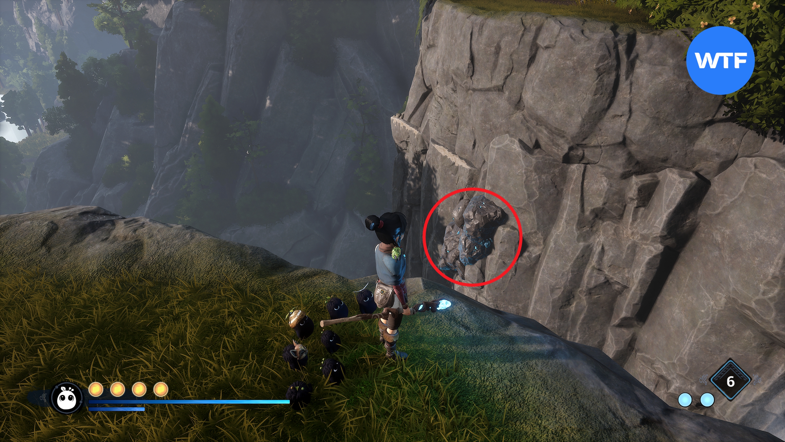 Двигайтесь по сюжетному пути пока не дойдете до точки быстрого перемещения «Вход в сердце деревни». От неё идите налево, а затем на развилке - направо. Киньте бомбу в кучу камней на скалах со скриншота ниже.