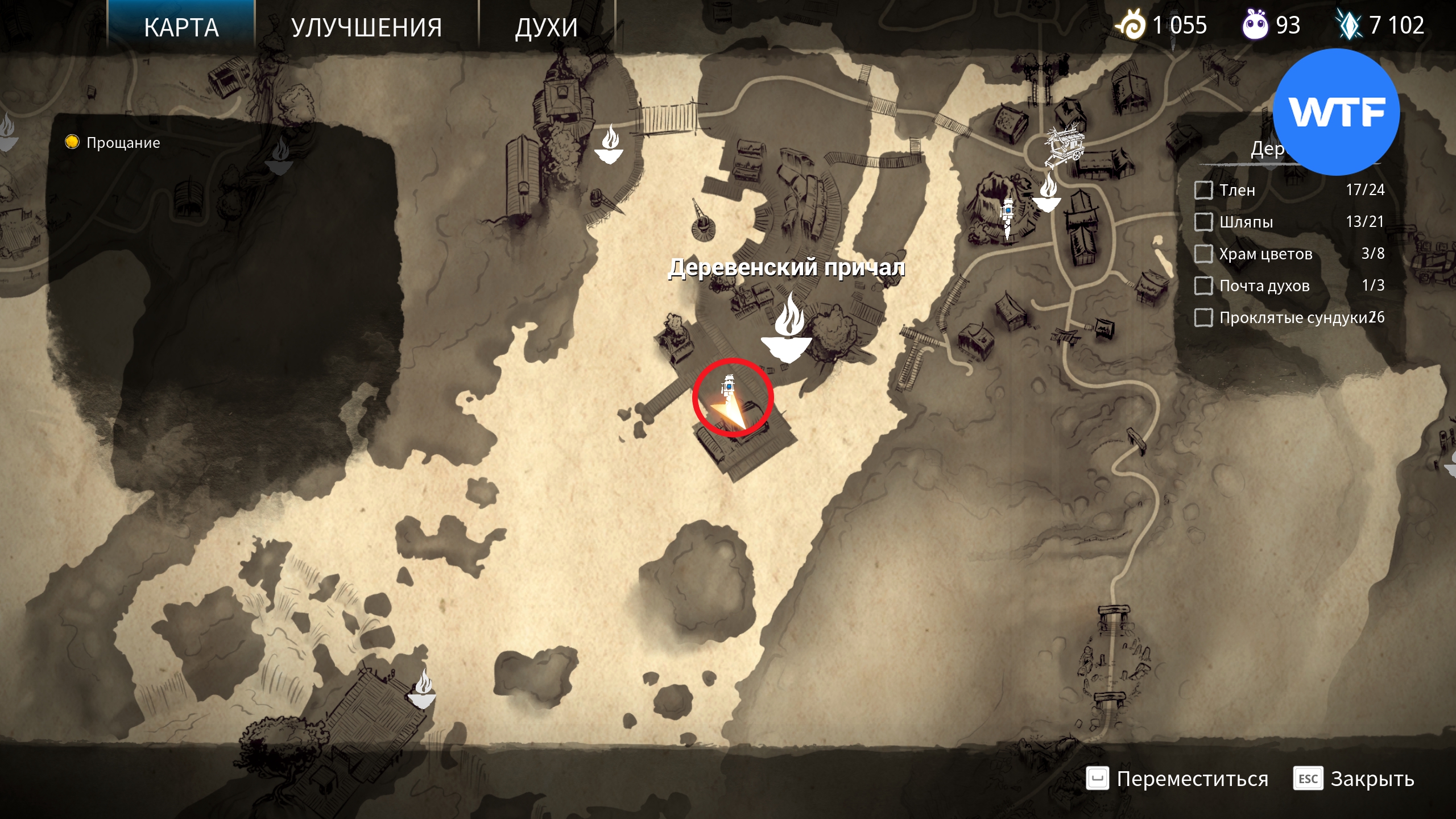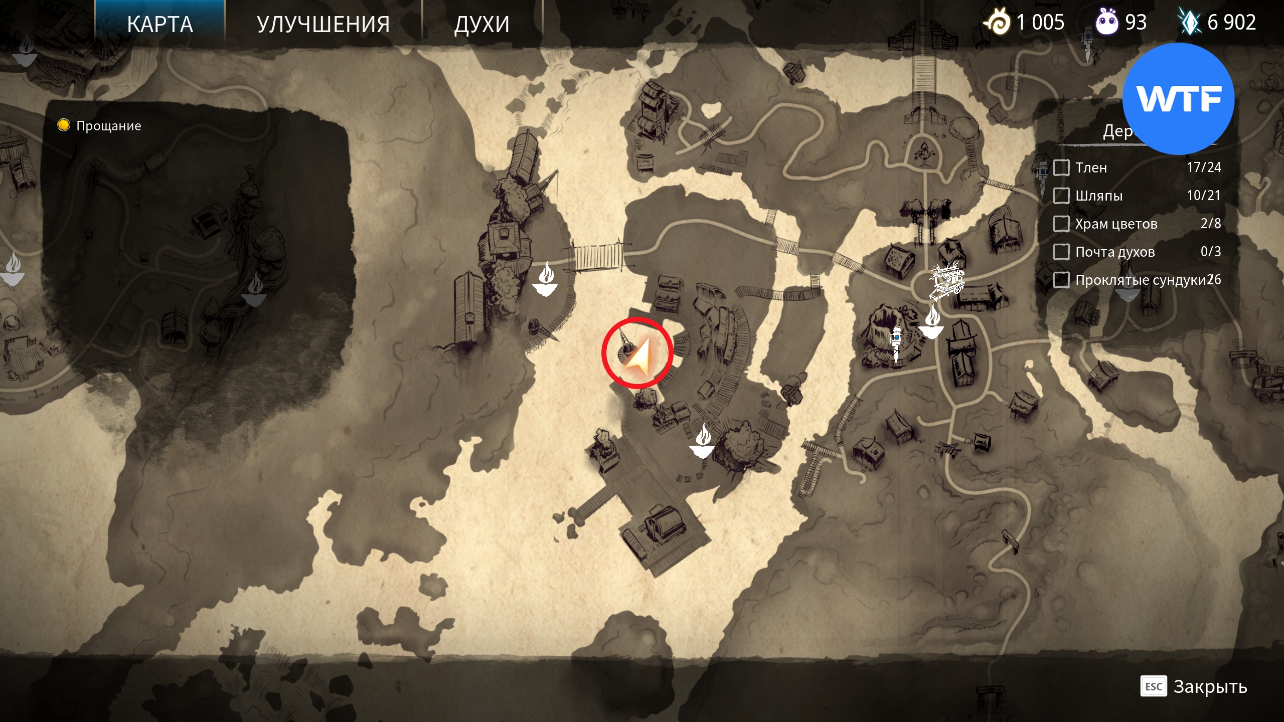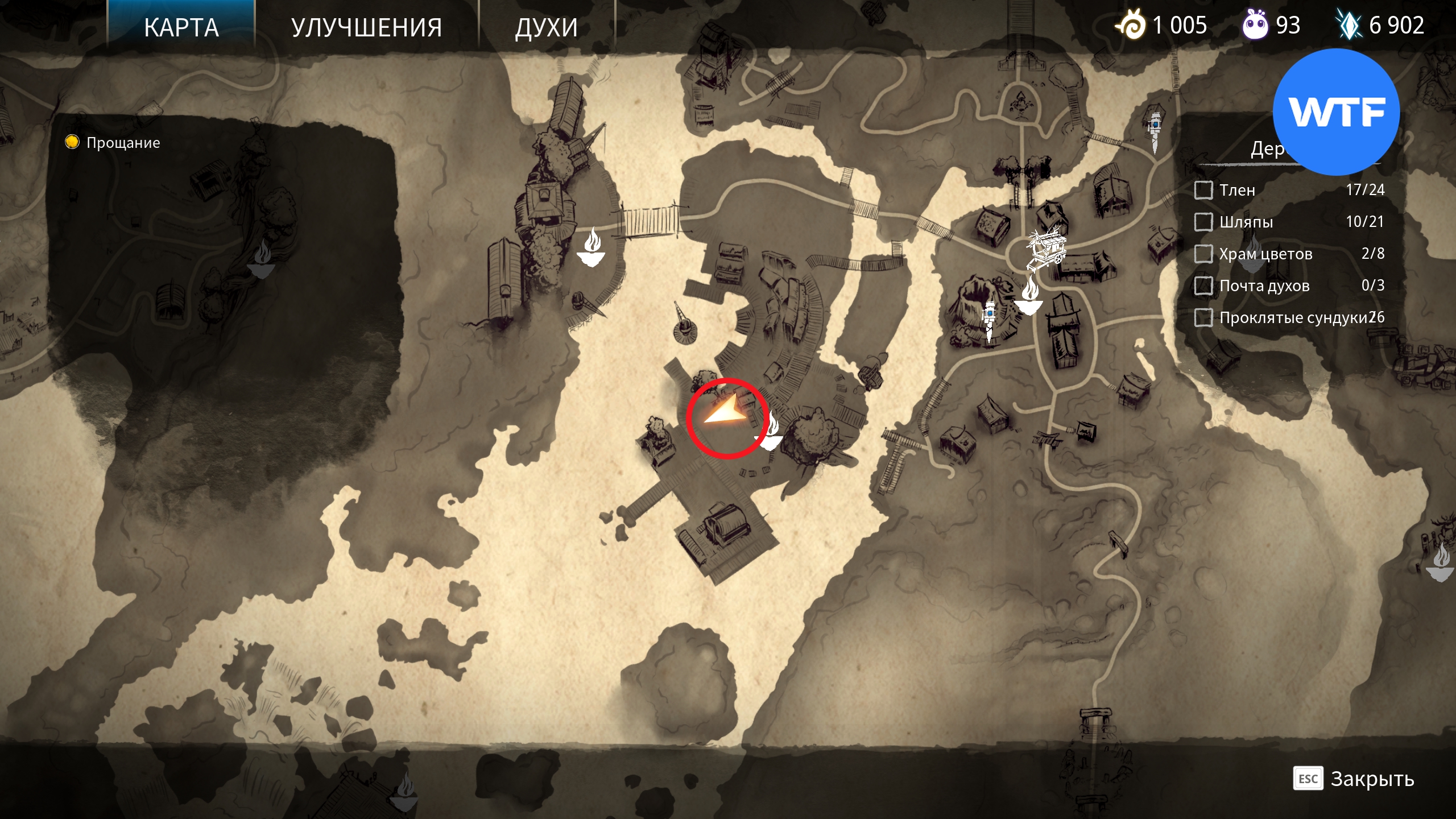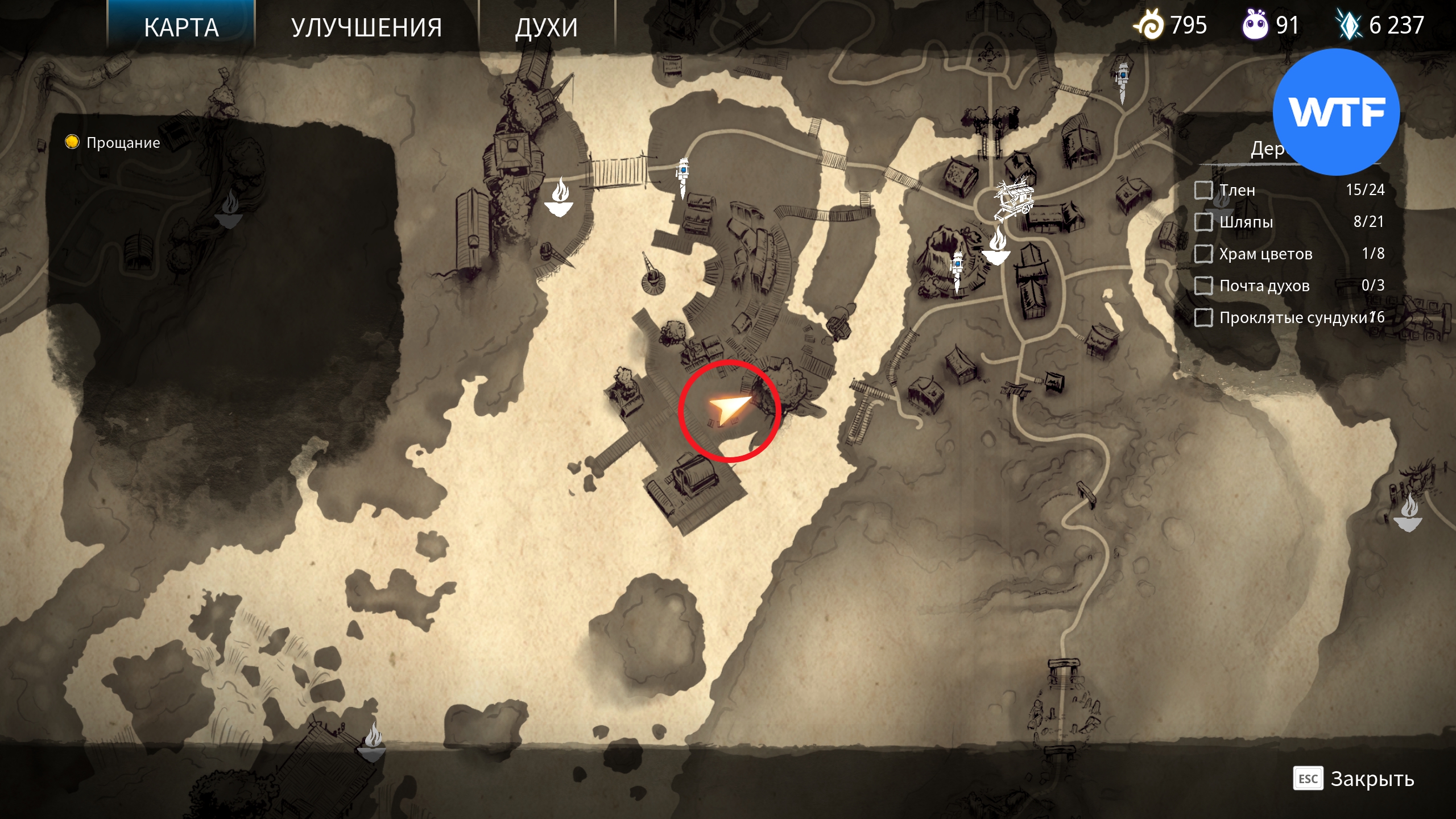 Пройдите сквозь фиолетовый барьер возле сундука, а затем доберитесь до отметки почты духов возле точки быстрого перемещения «Деревенский причал». Вам нужно подняться на самый верх, чтобы очистить область от скверны. Там же вы найдете сундук с этим тленышем.