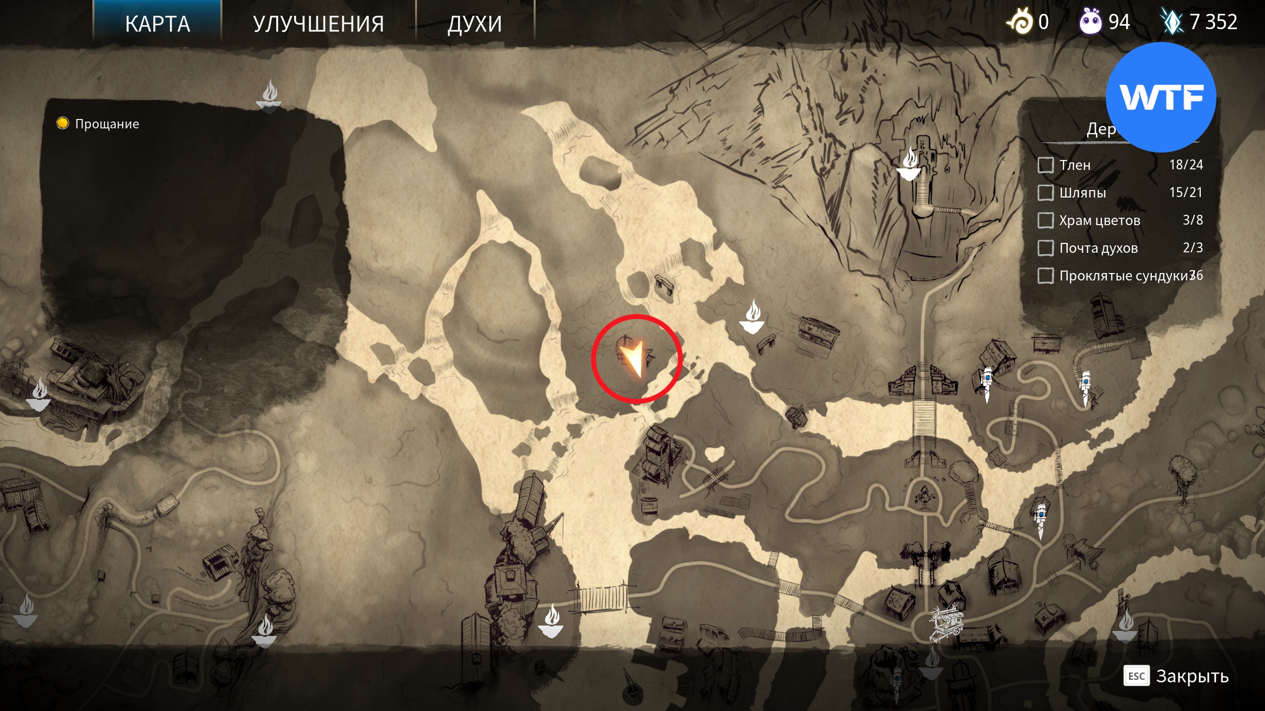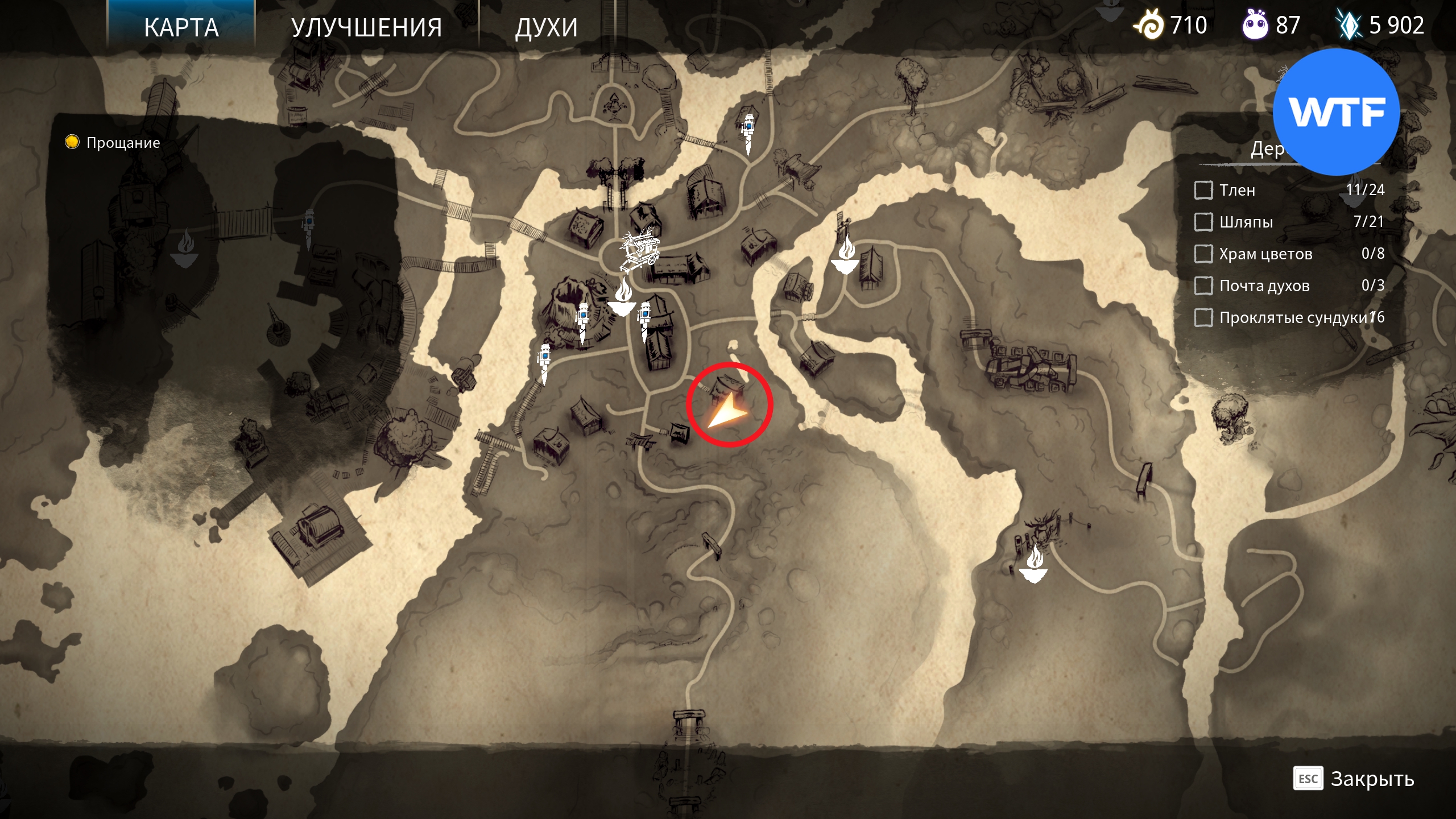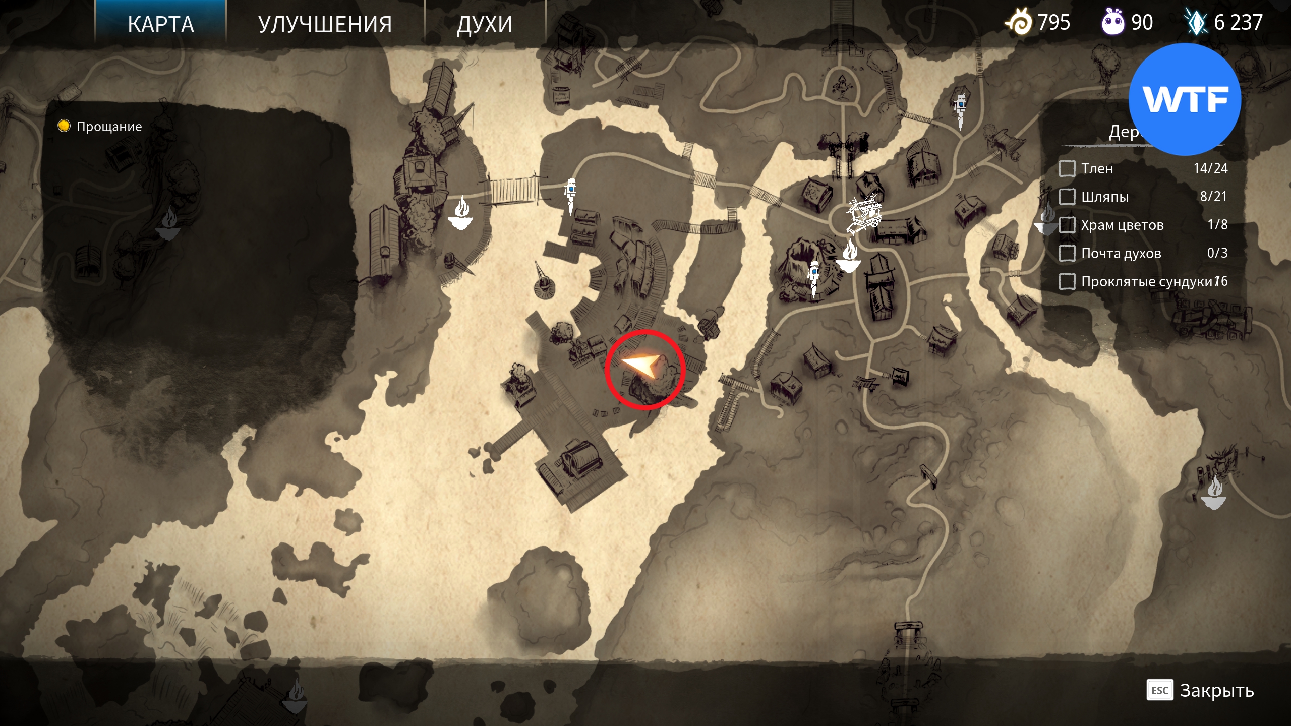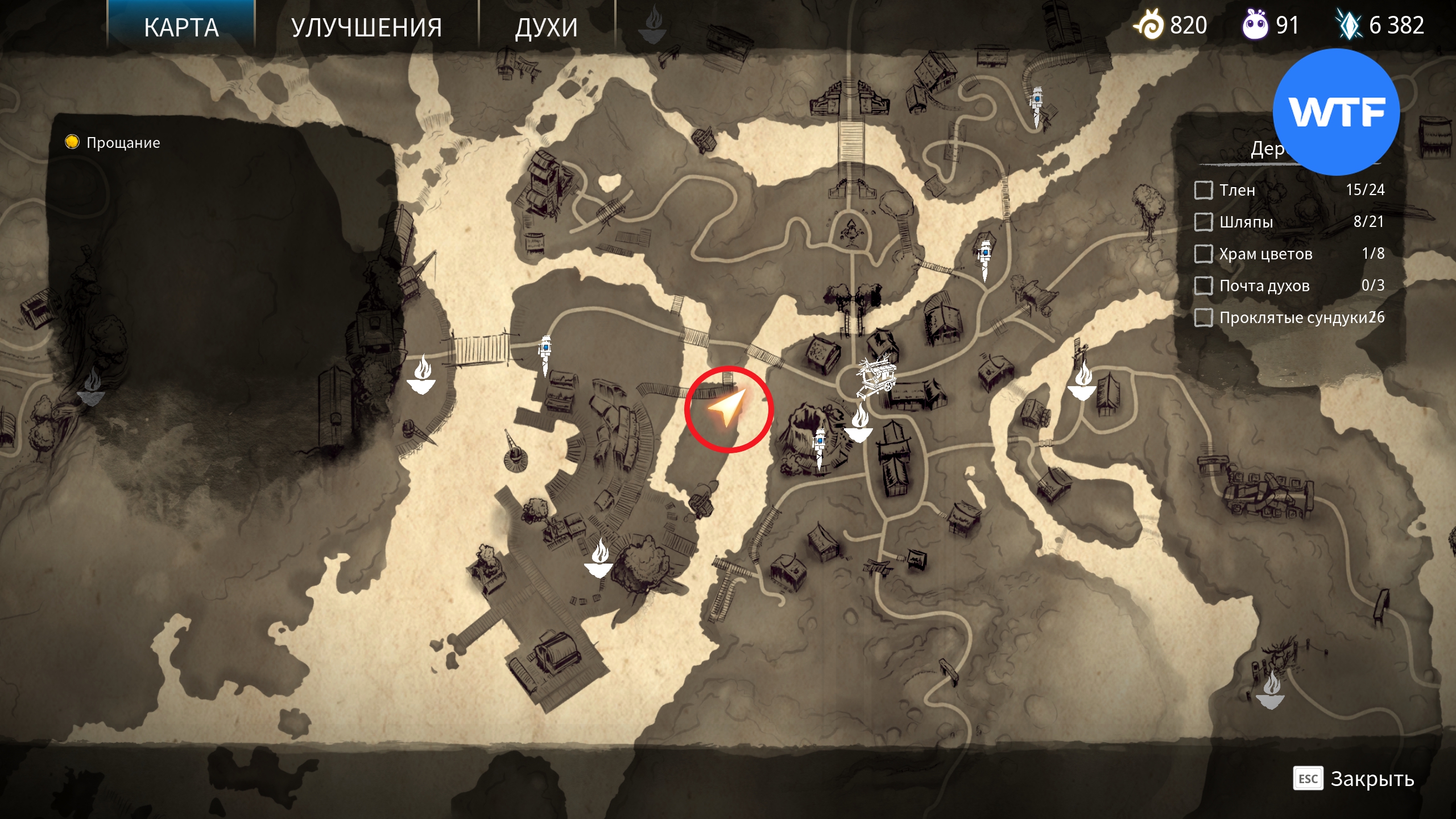Пройдите сквозь фиолетовый барьер возле сундука, а затем доберитесь до отметки почты духов возле точки быстрого перемещения «Деревенский причал». Вам нужно подняться на самый верх, чтобы очистить область от скверны. Там же вы найдете сундук с этим тленышем.