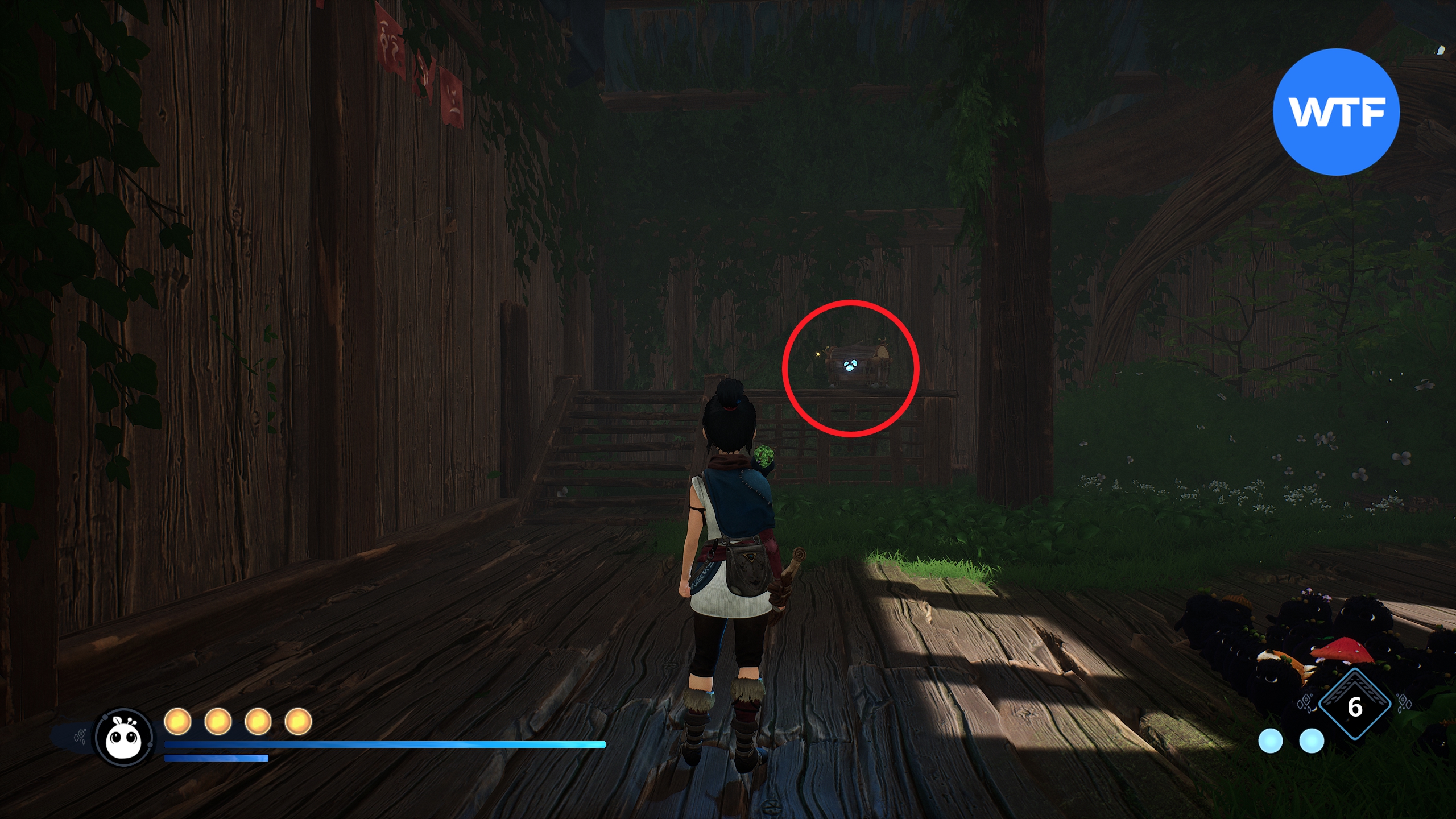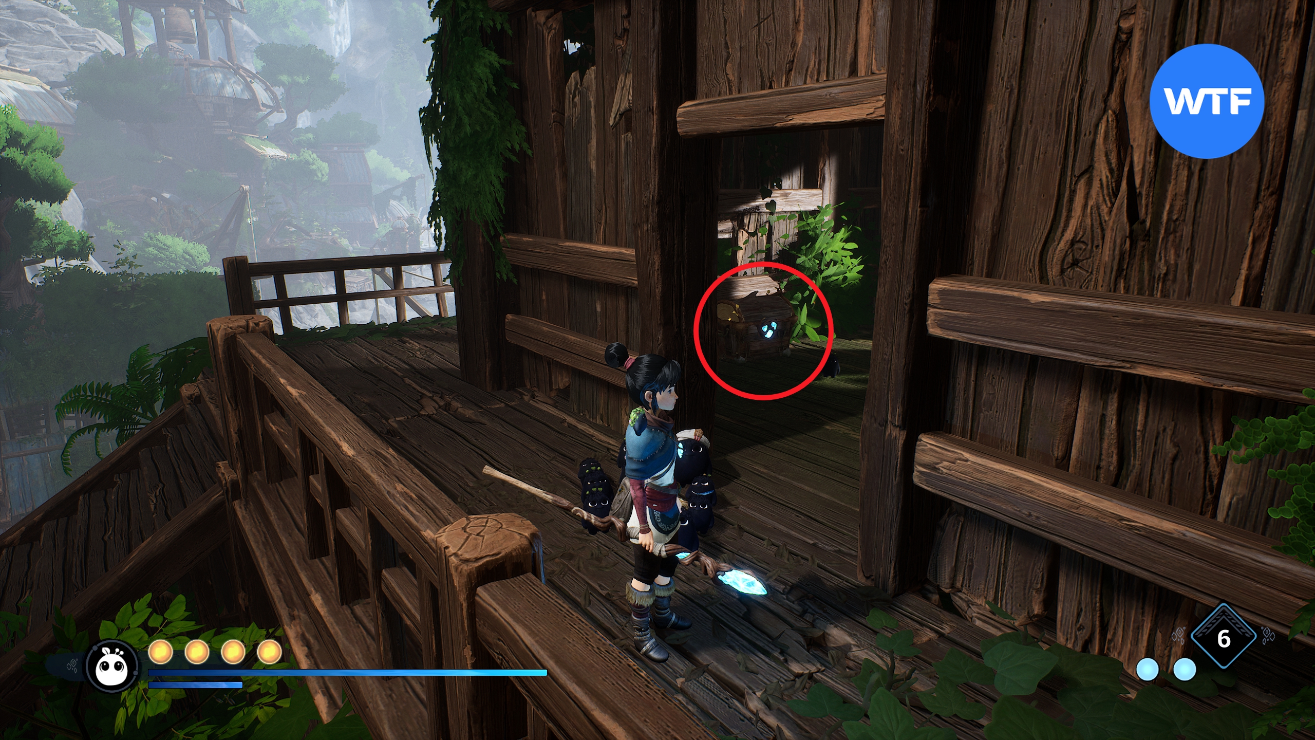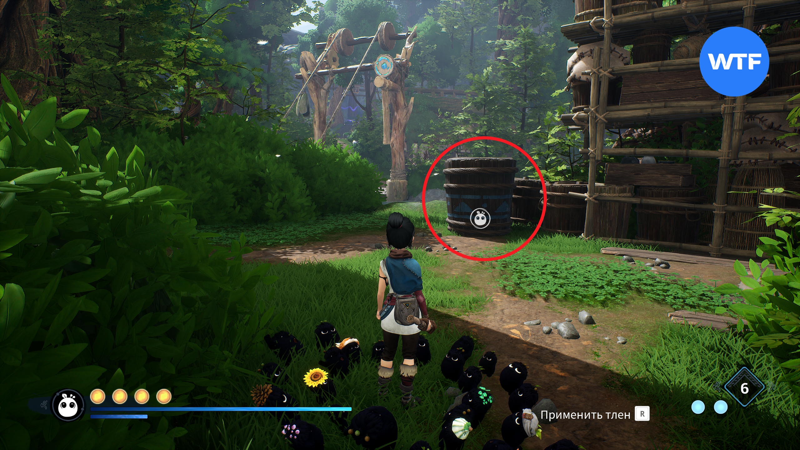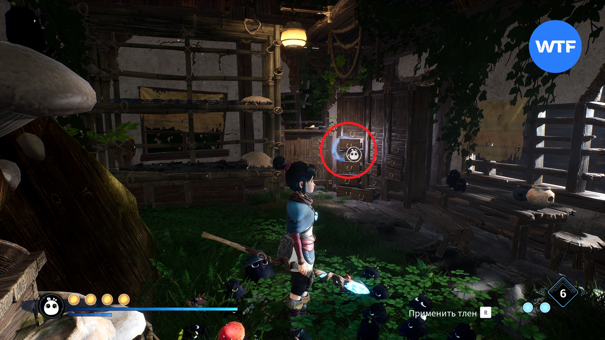 Возле платформы с совами есть область, открывающаяся при помощи почты духов. Разберитесь с врагами, а затем стреляйте в синий цветок на круглой платформе в центре. Прямо под ним к столбику привязано ведро с этим тленышем.