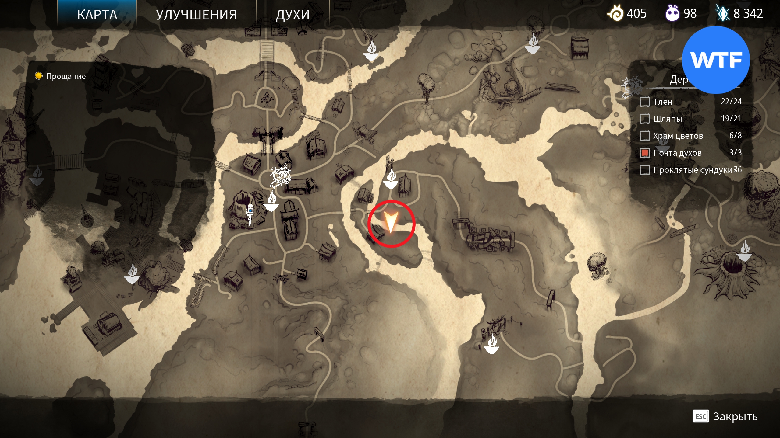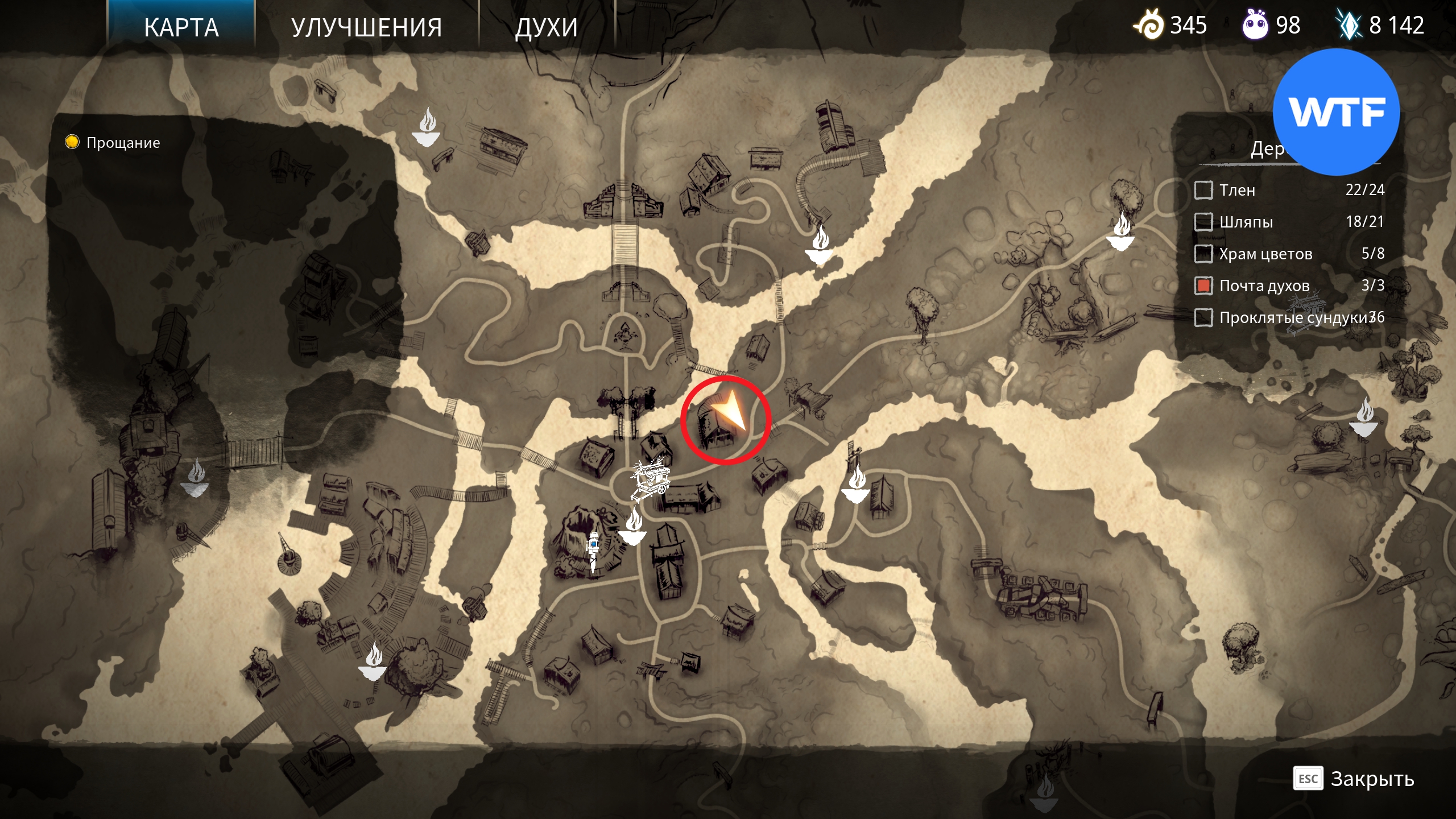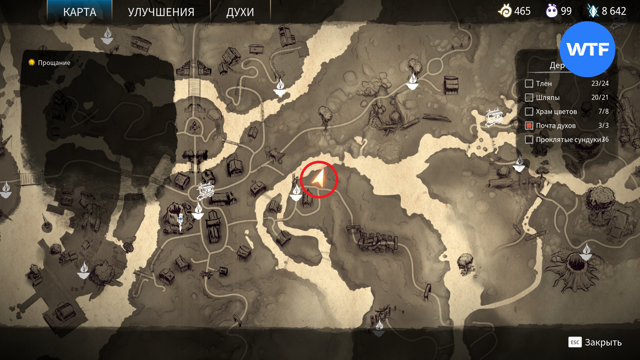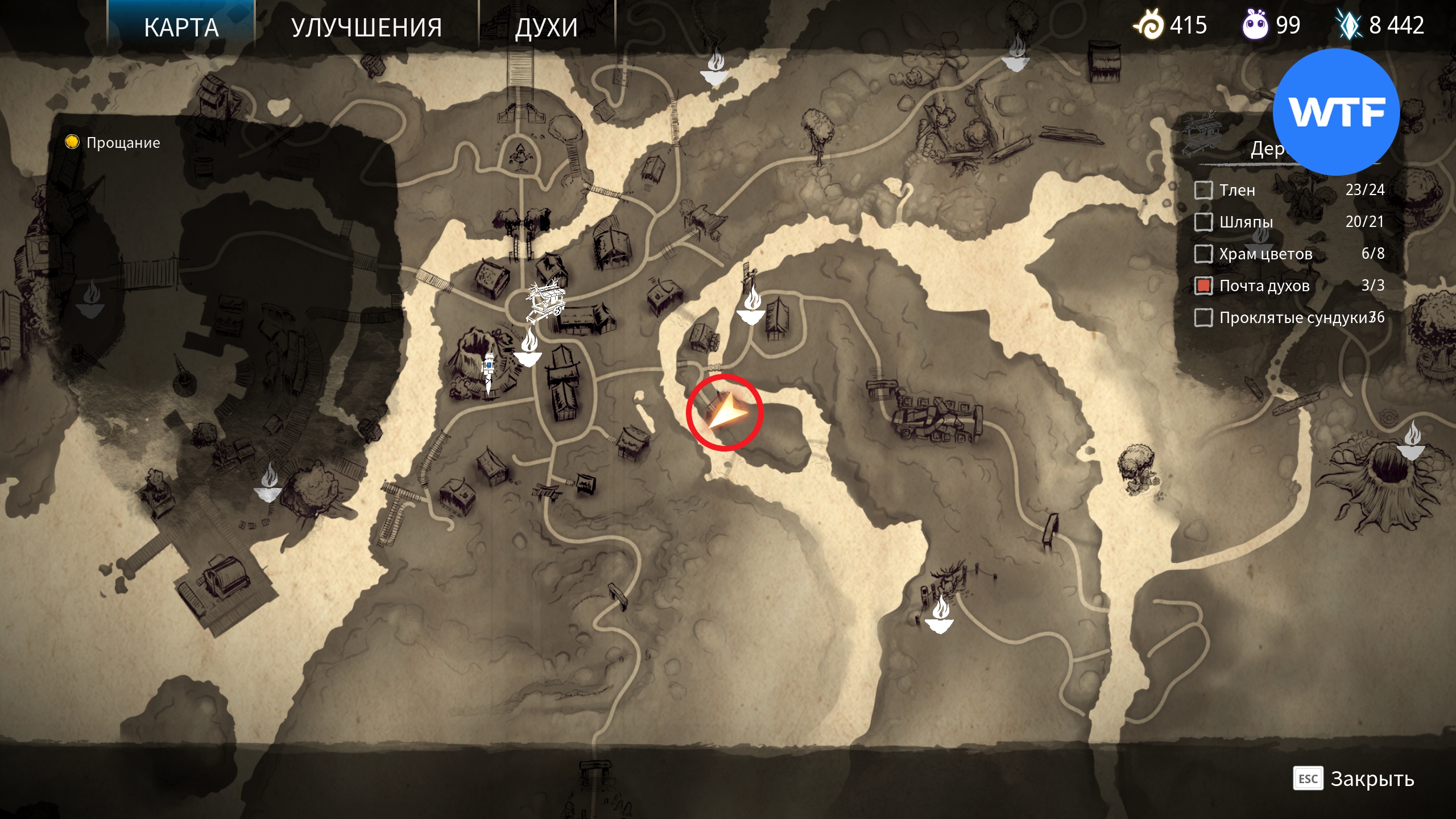 Вернитесь в «Центр деревни» и идите к единственной оставшейся метке почты духов. Очистив область от порчи, вы окажетесь прямо перед тремя проклятыми сундуками.