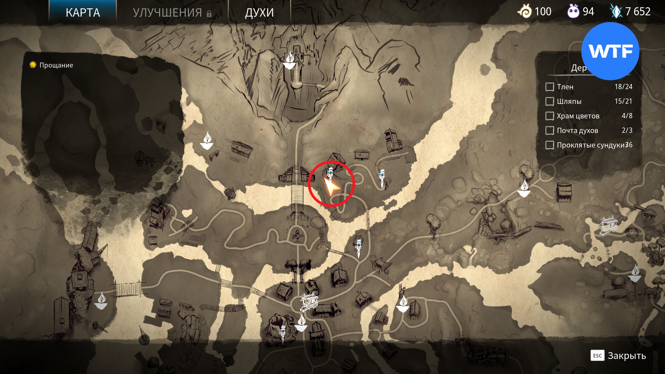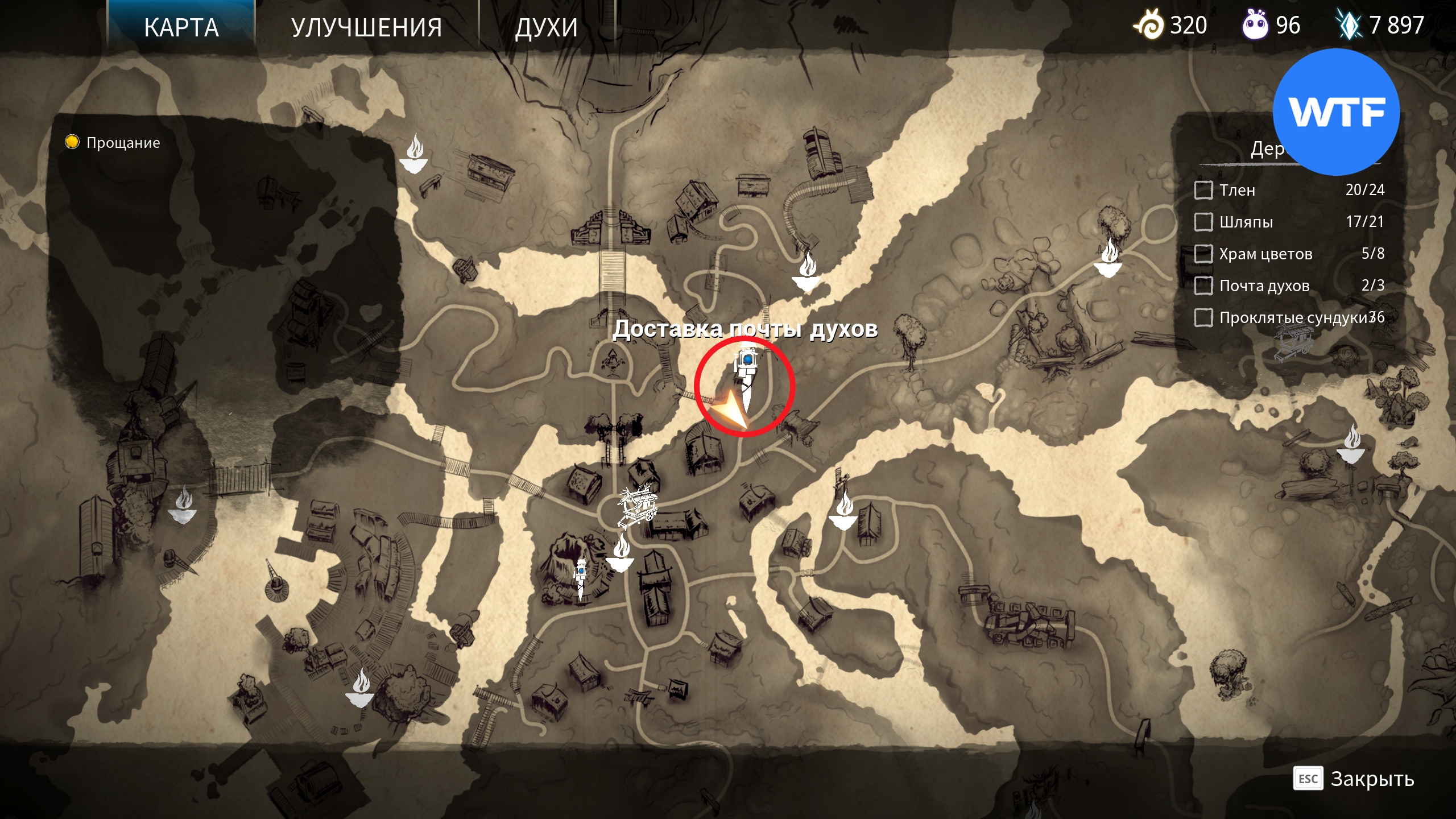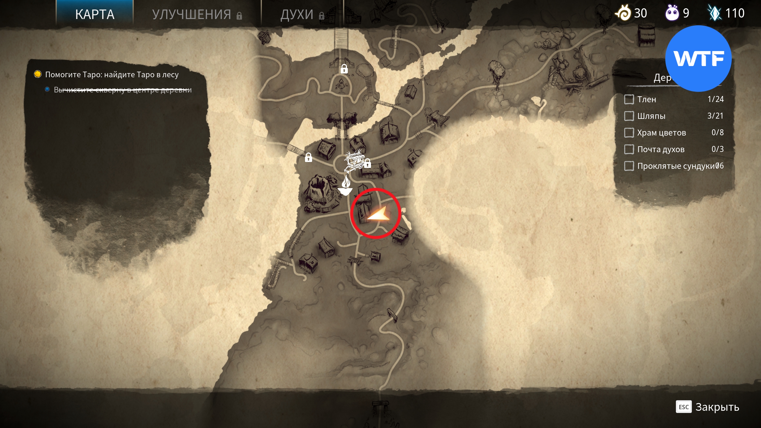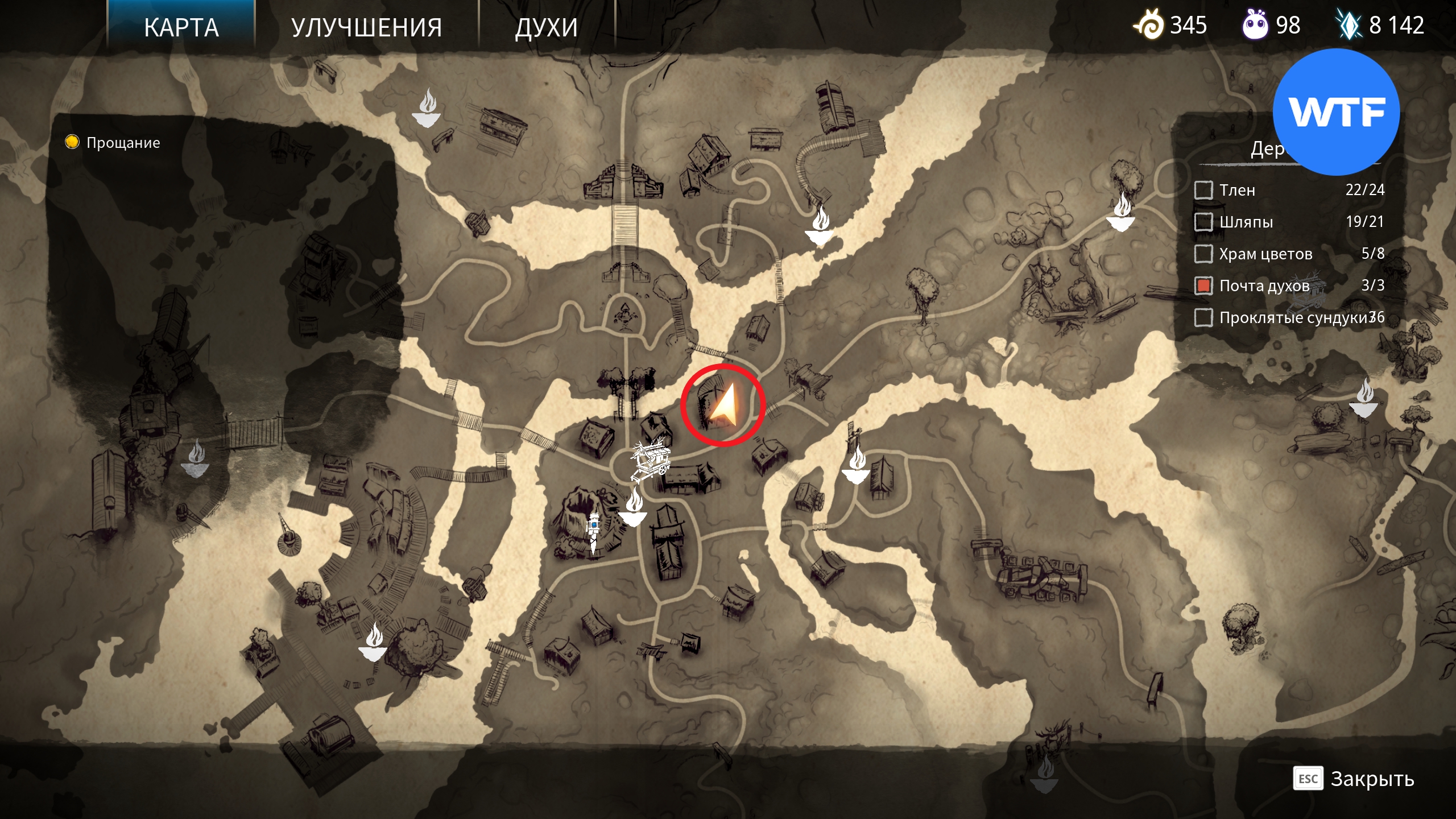 Вернитесь в «Центр деревни» и идите к единственной оставшейся метке почты духов. Очистив область от порчи, вы окажетесь прямо перед тремя проклятыми сундуками.