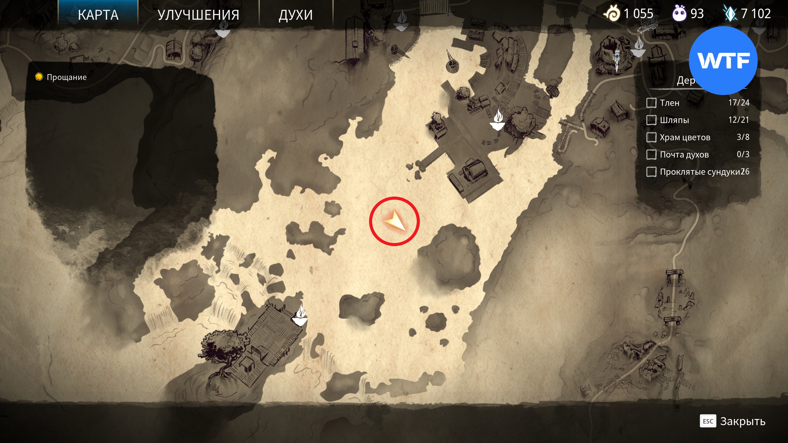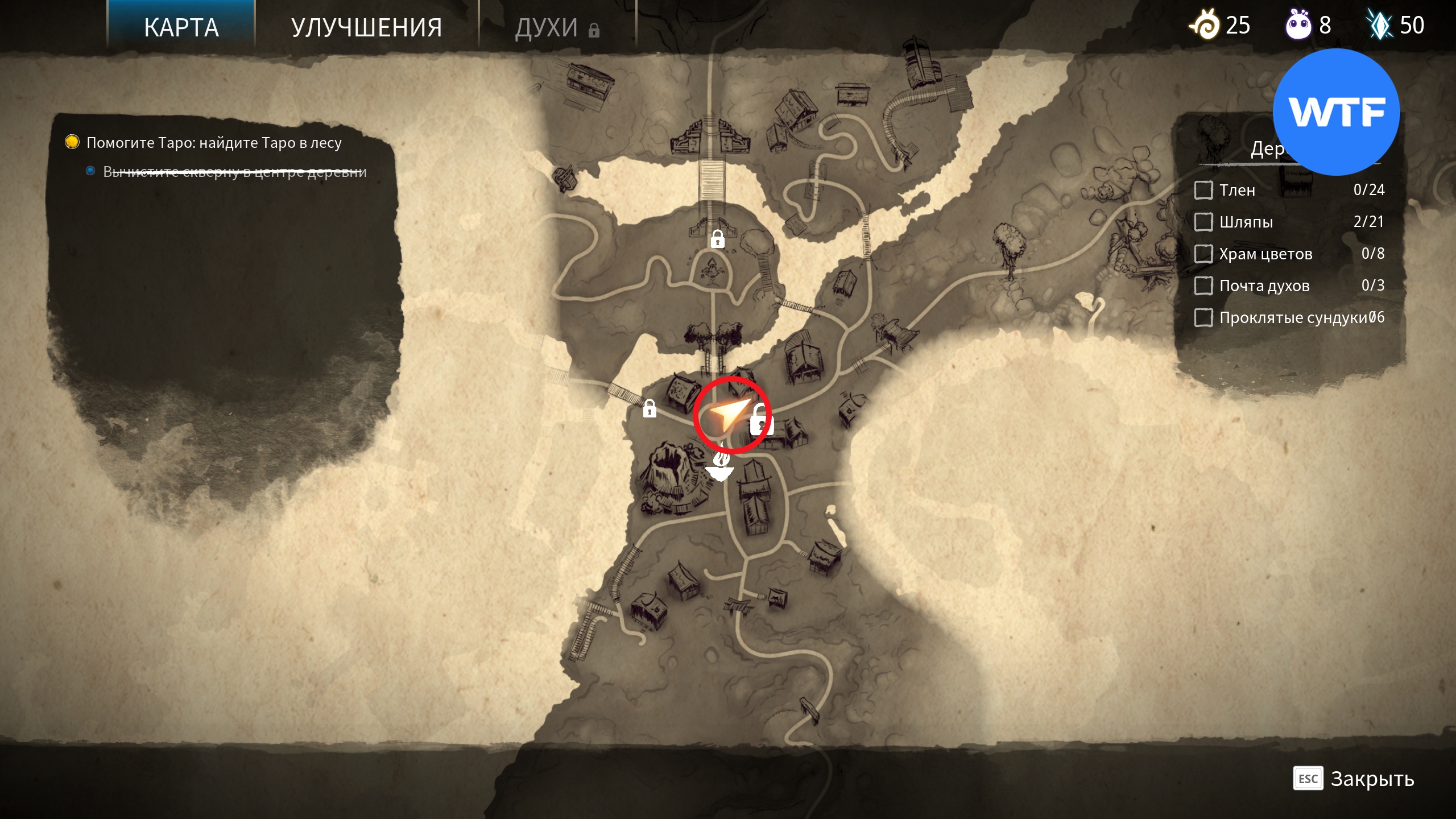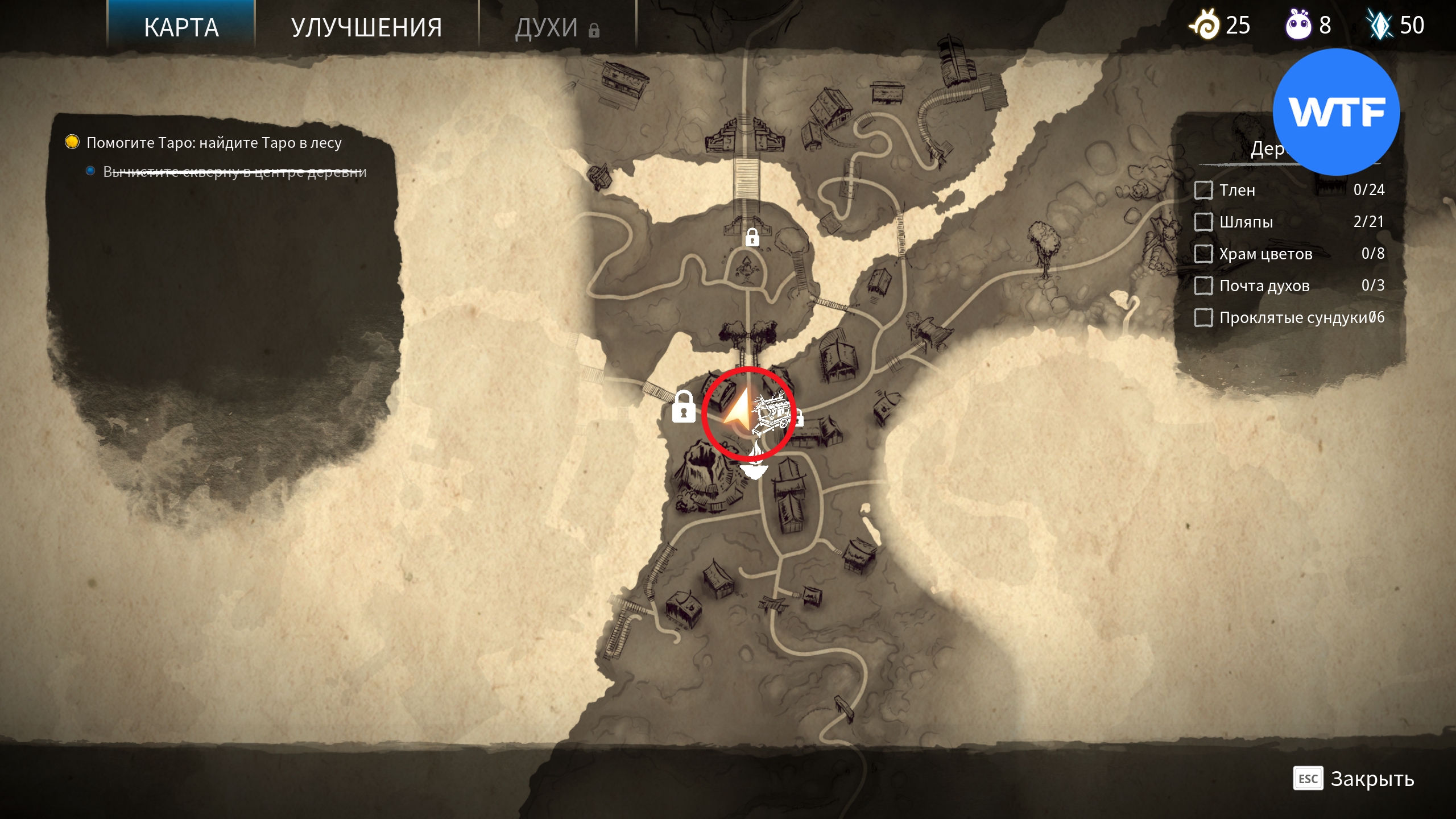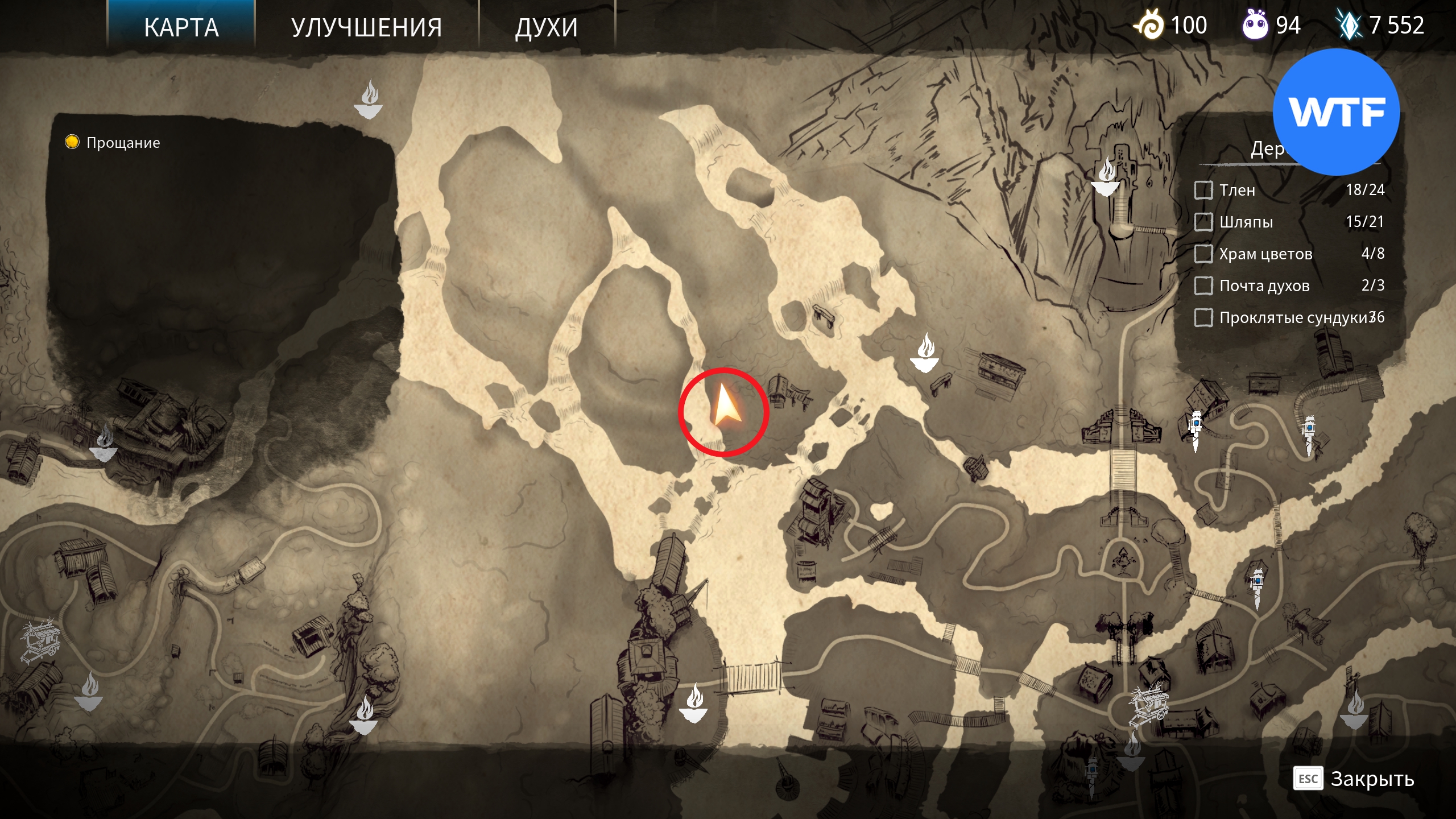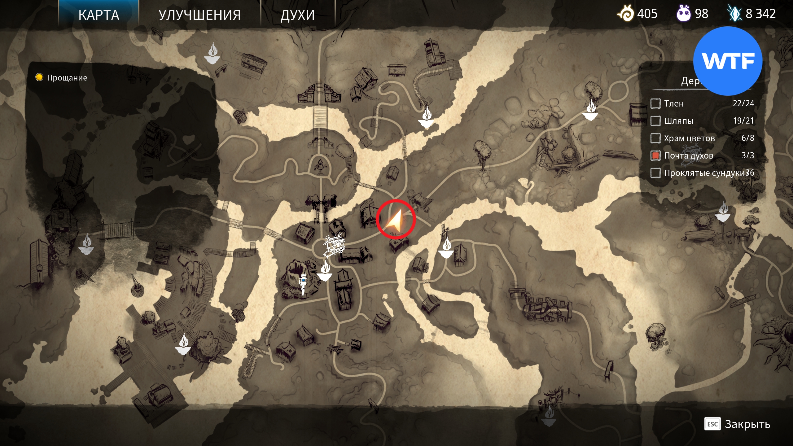 Вернитесь в «Центр деревни» и идите к единственной оставшейся метке почты духов. Очистив область от порчи, вы окажетесь прямо перед тремя проклятыми сундуками.