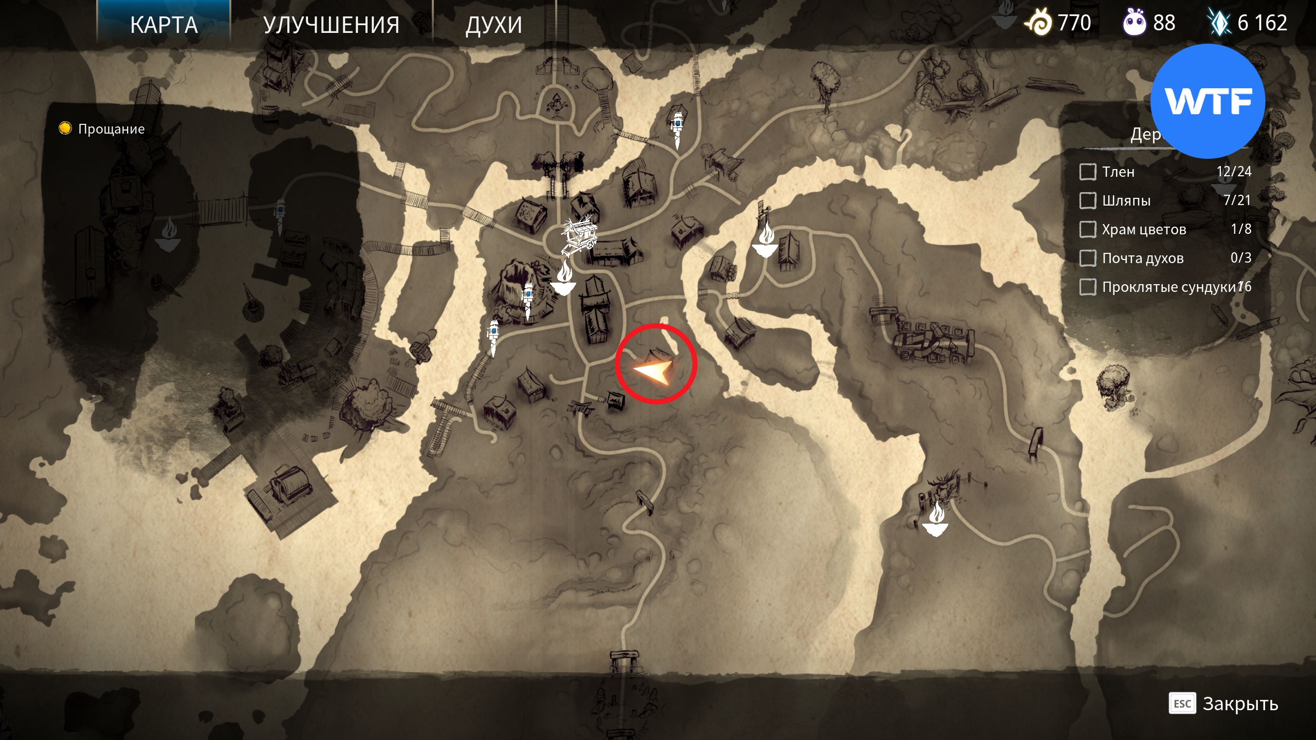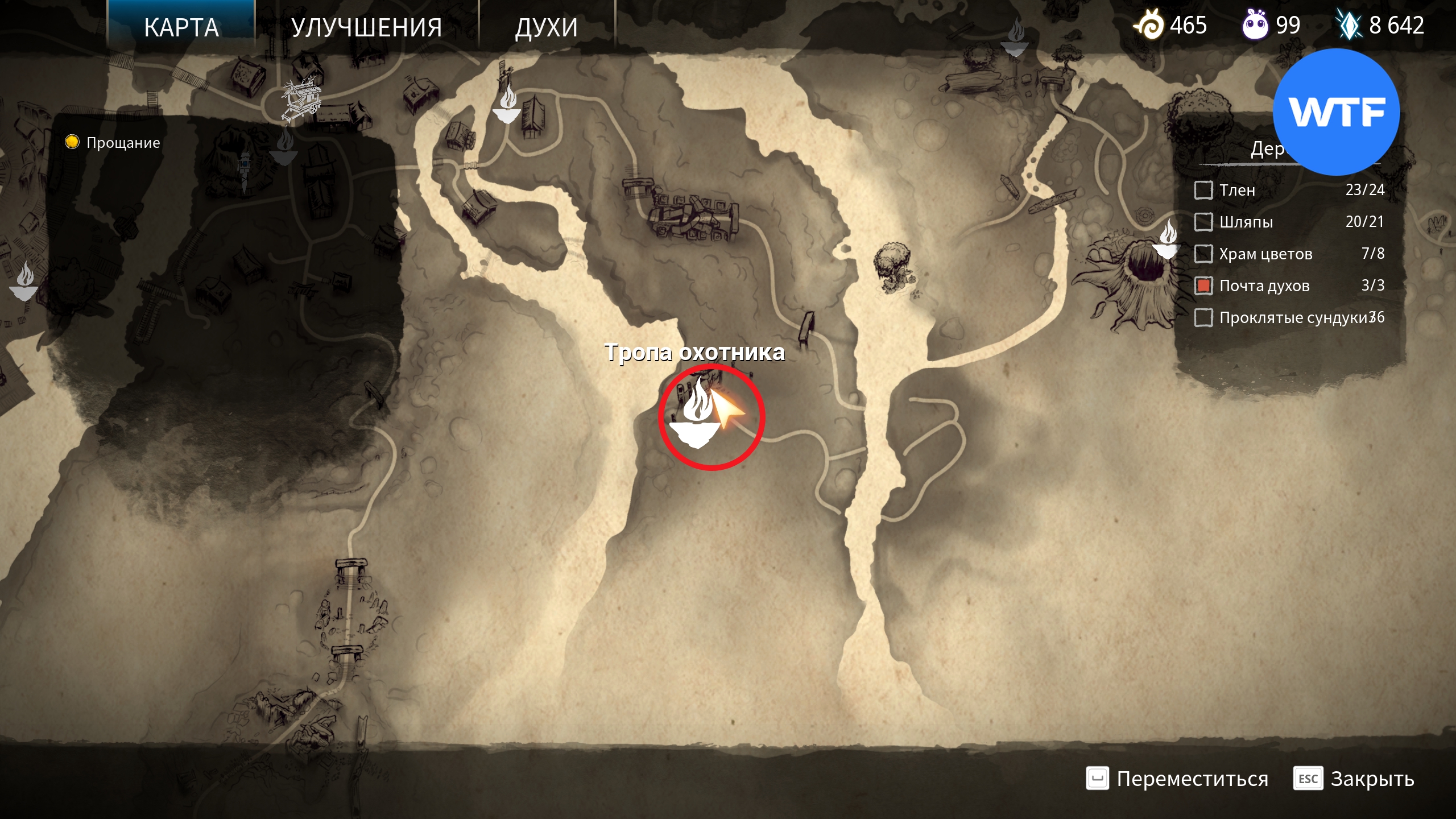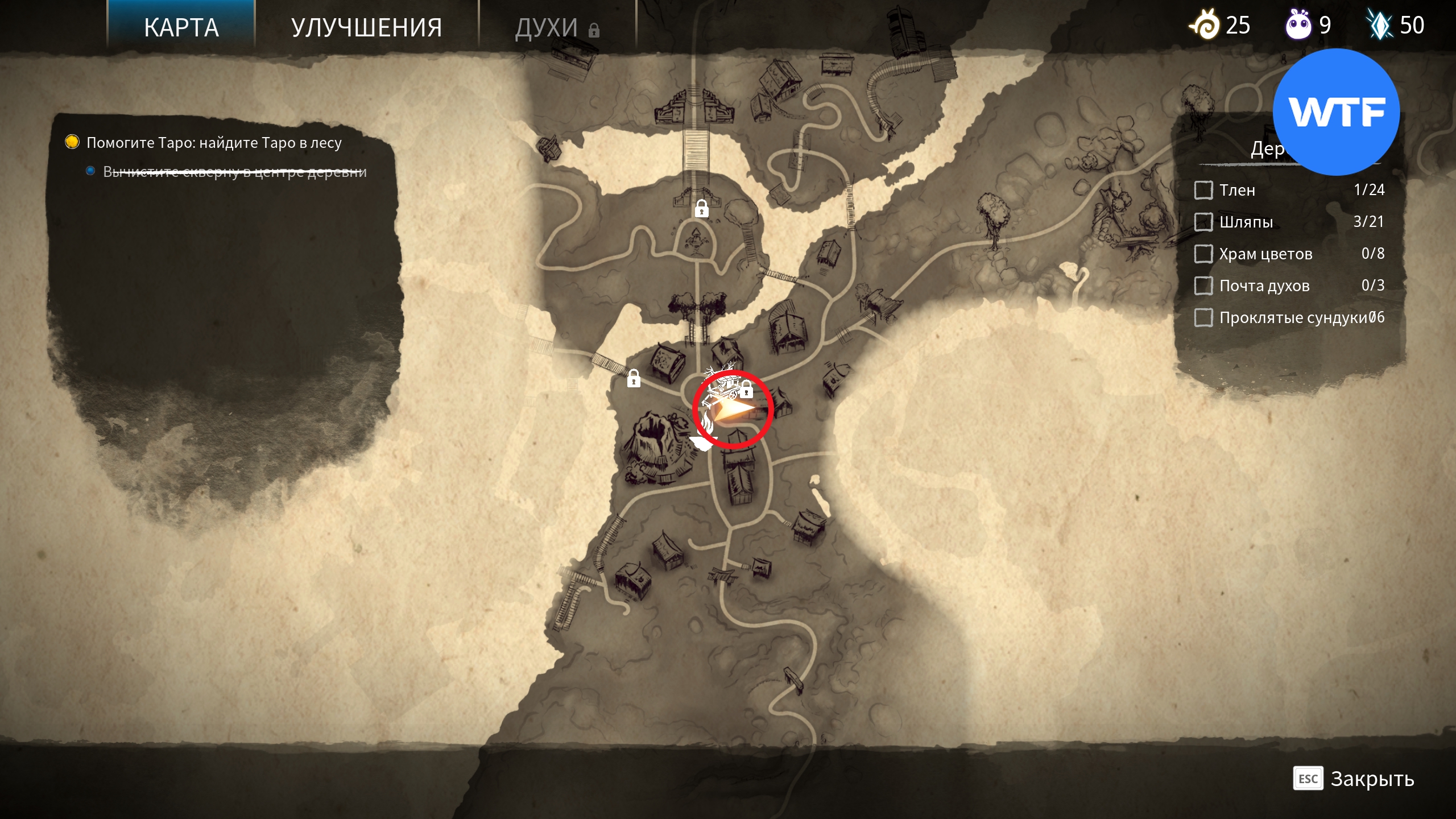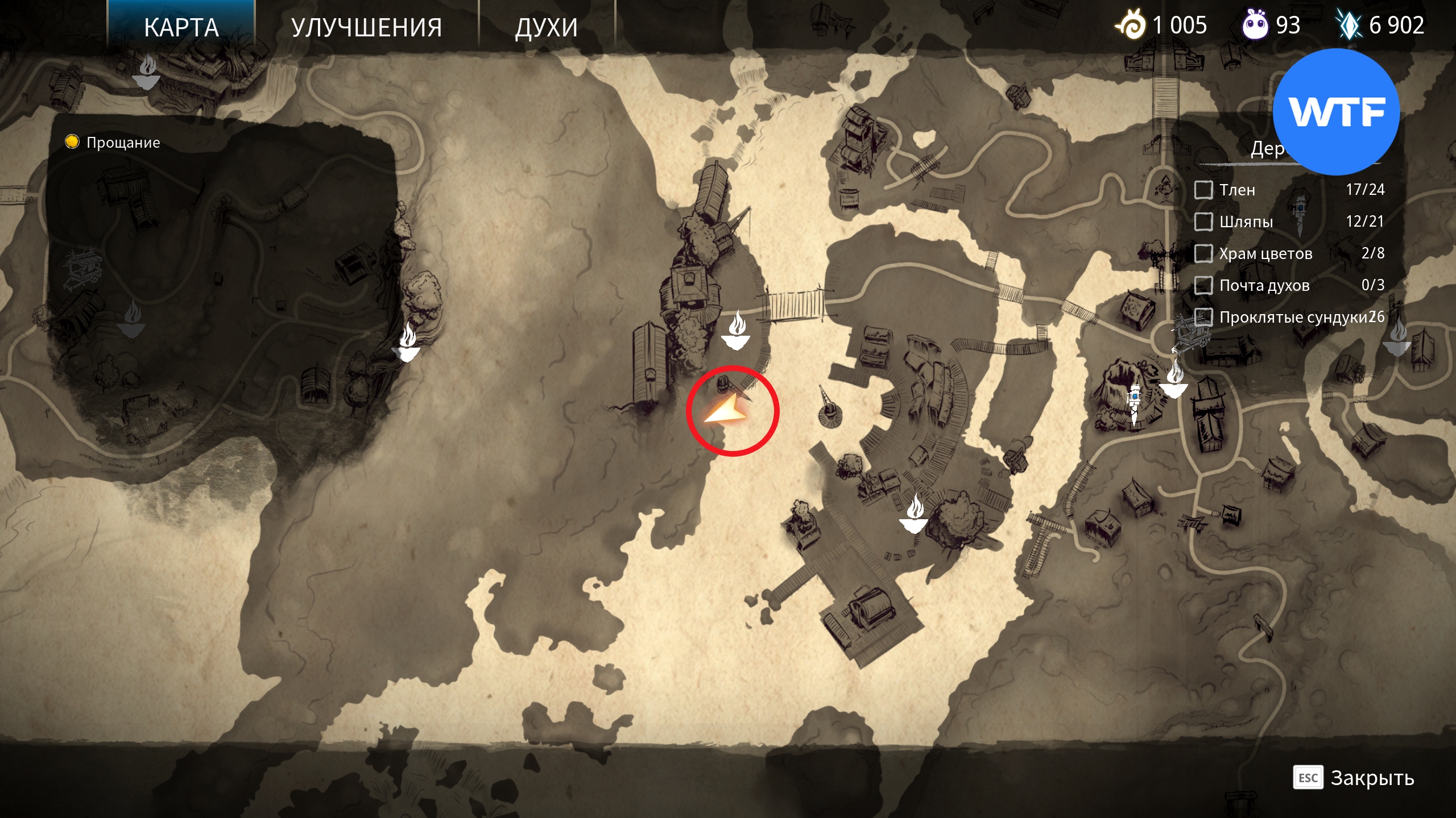 Вернитесь в «Центр деревни» и идите к единственной оставшейся метке почты духов. Очистив область от порчи, вы окажетесь прямо перед тремя проклятыми сундуками.