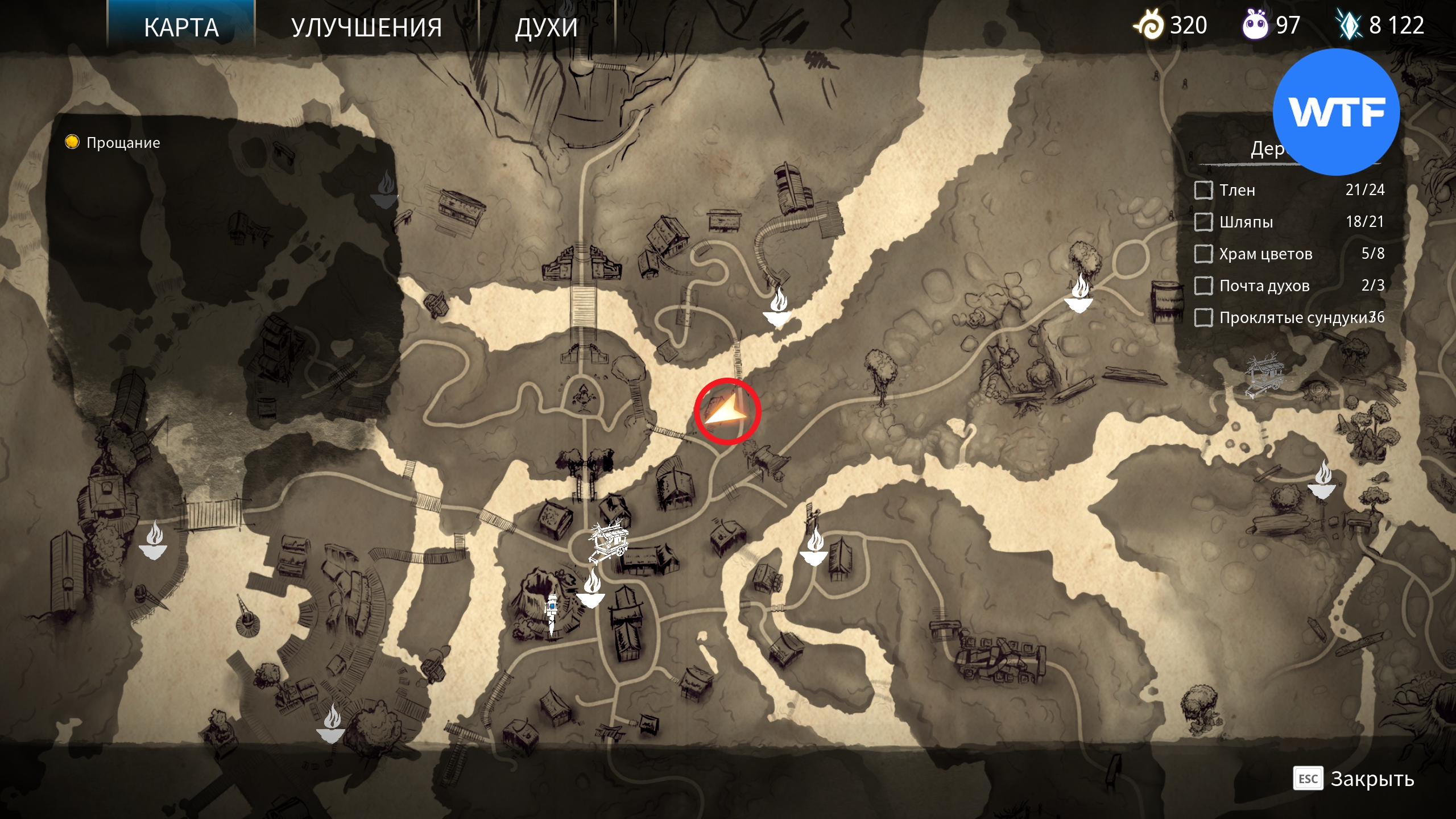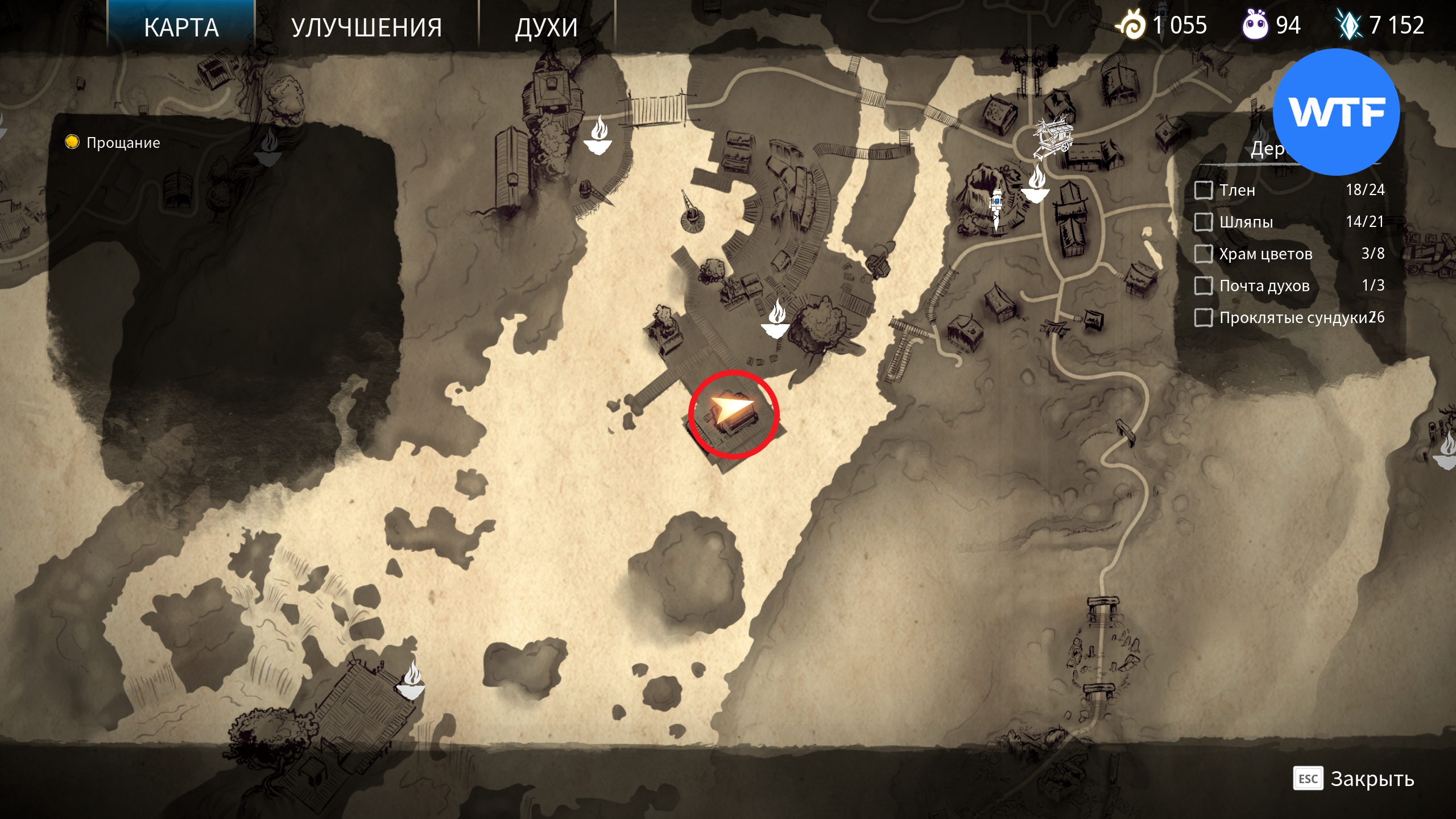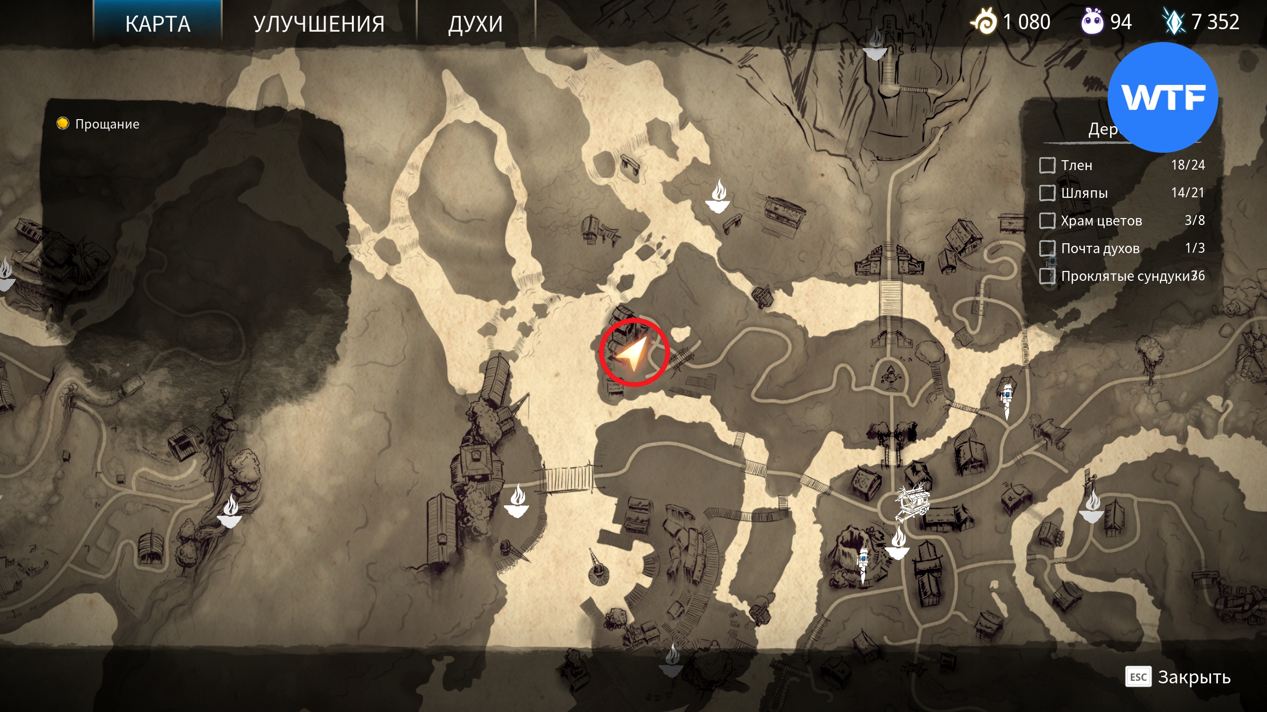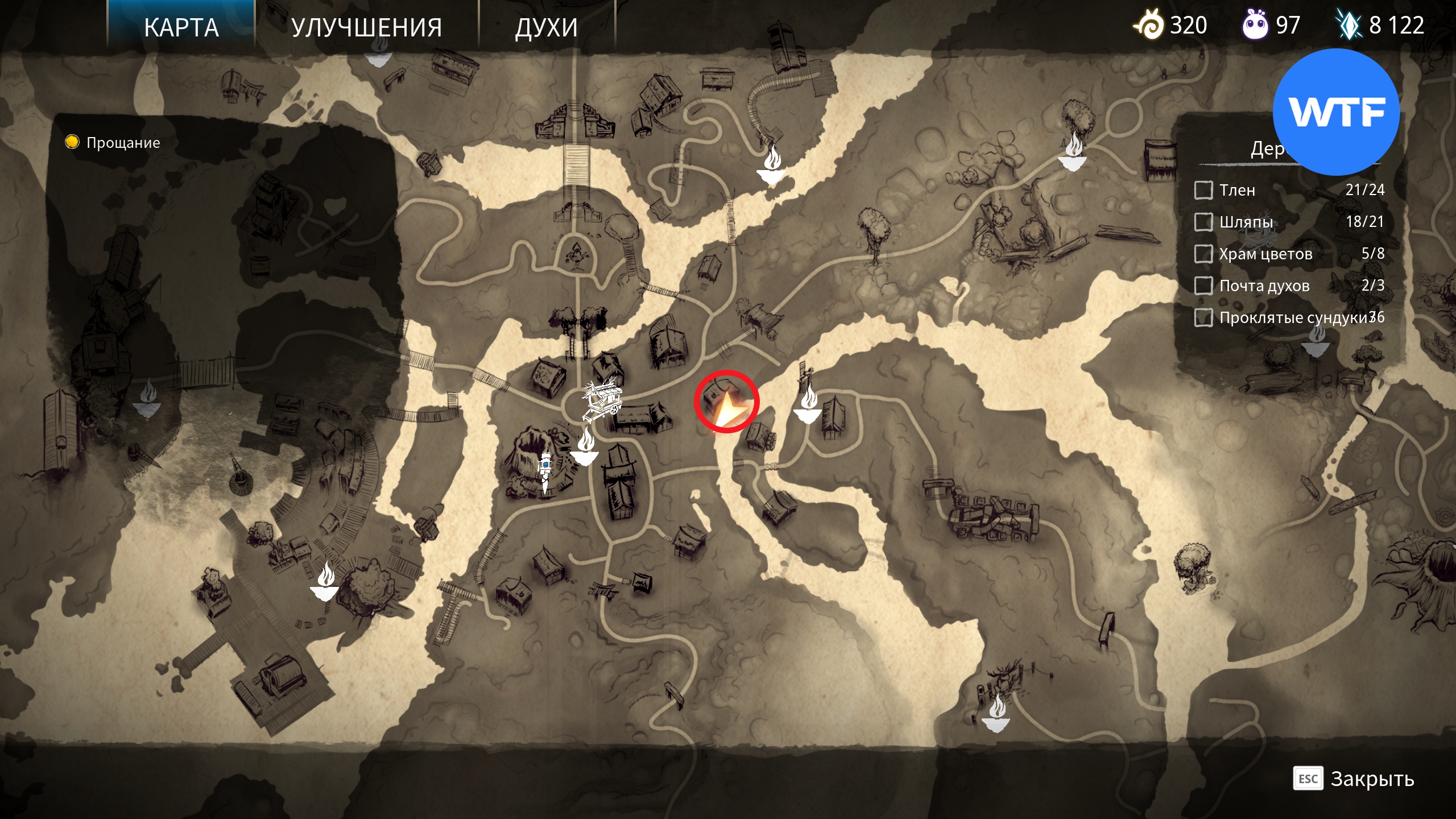 Отправляйтесь к самой южной отметке почты духов. Откройте область, очистите её от скверны, а затем зайдите в дом, отмеченный на карте ниже. Внутри есть сундук с этой шляпой.