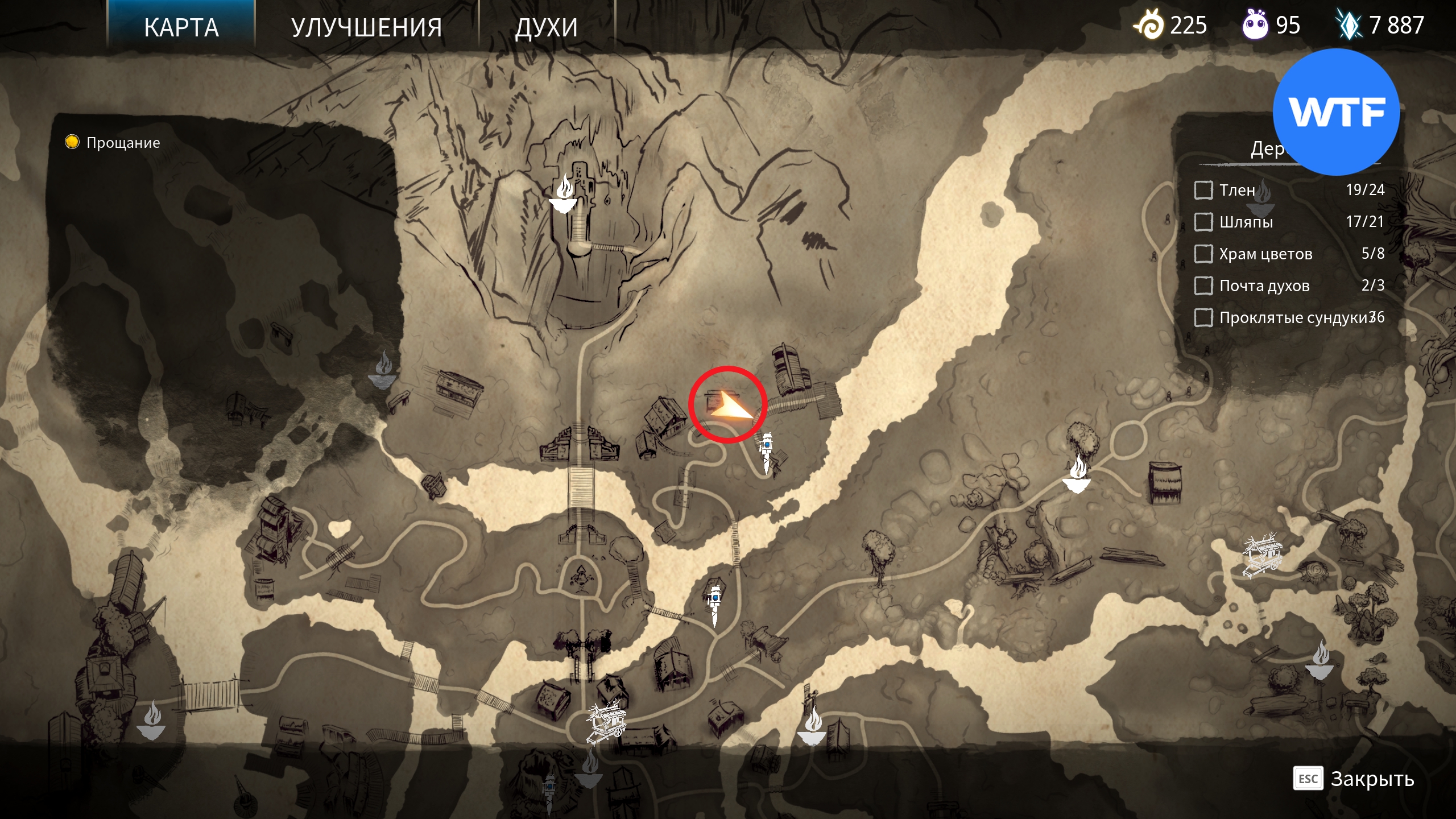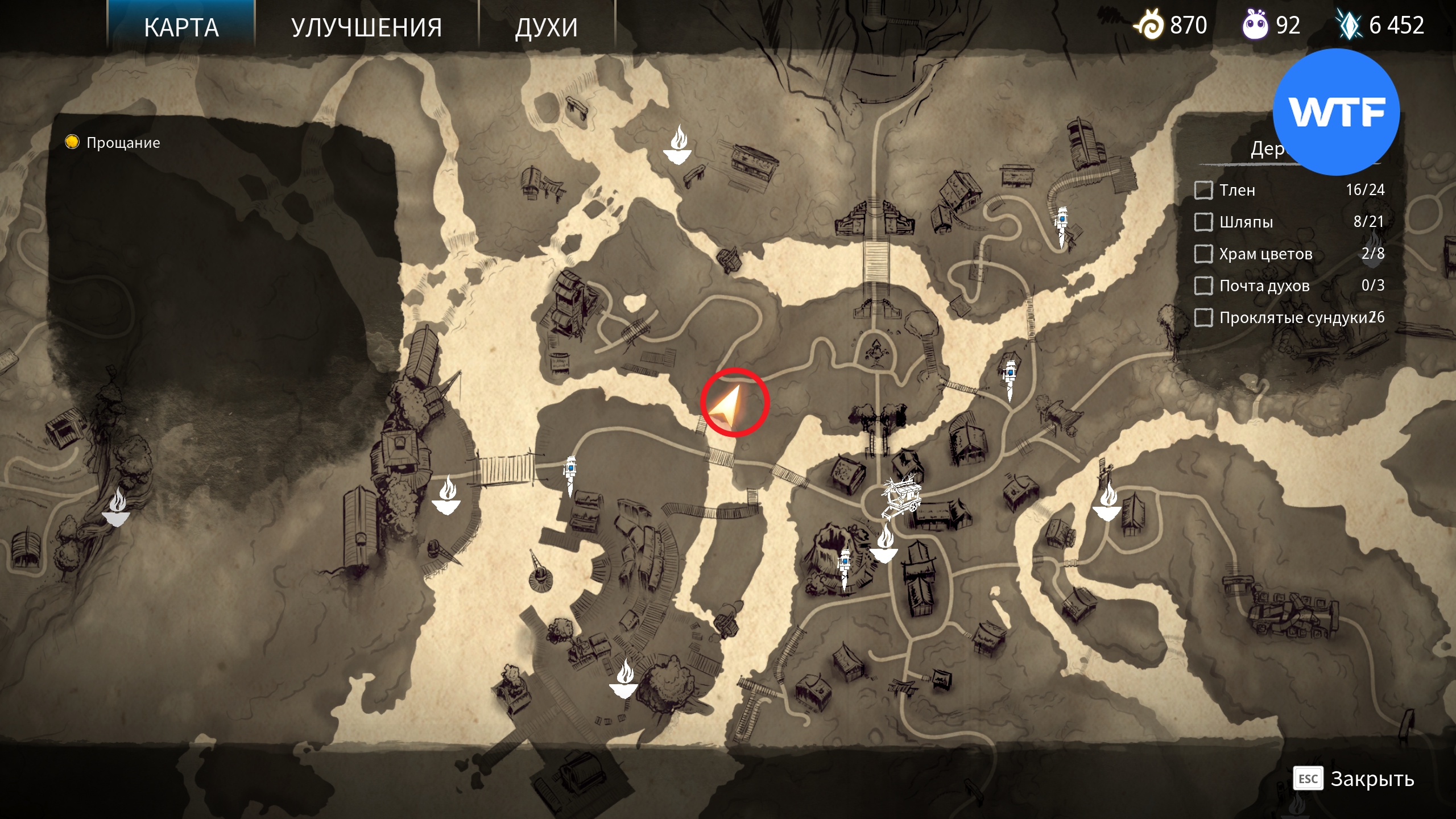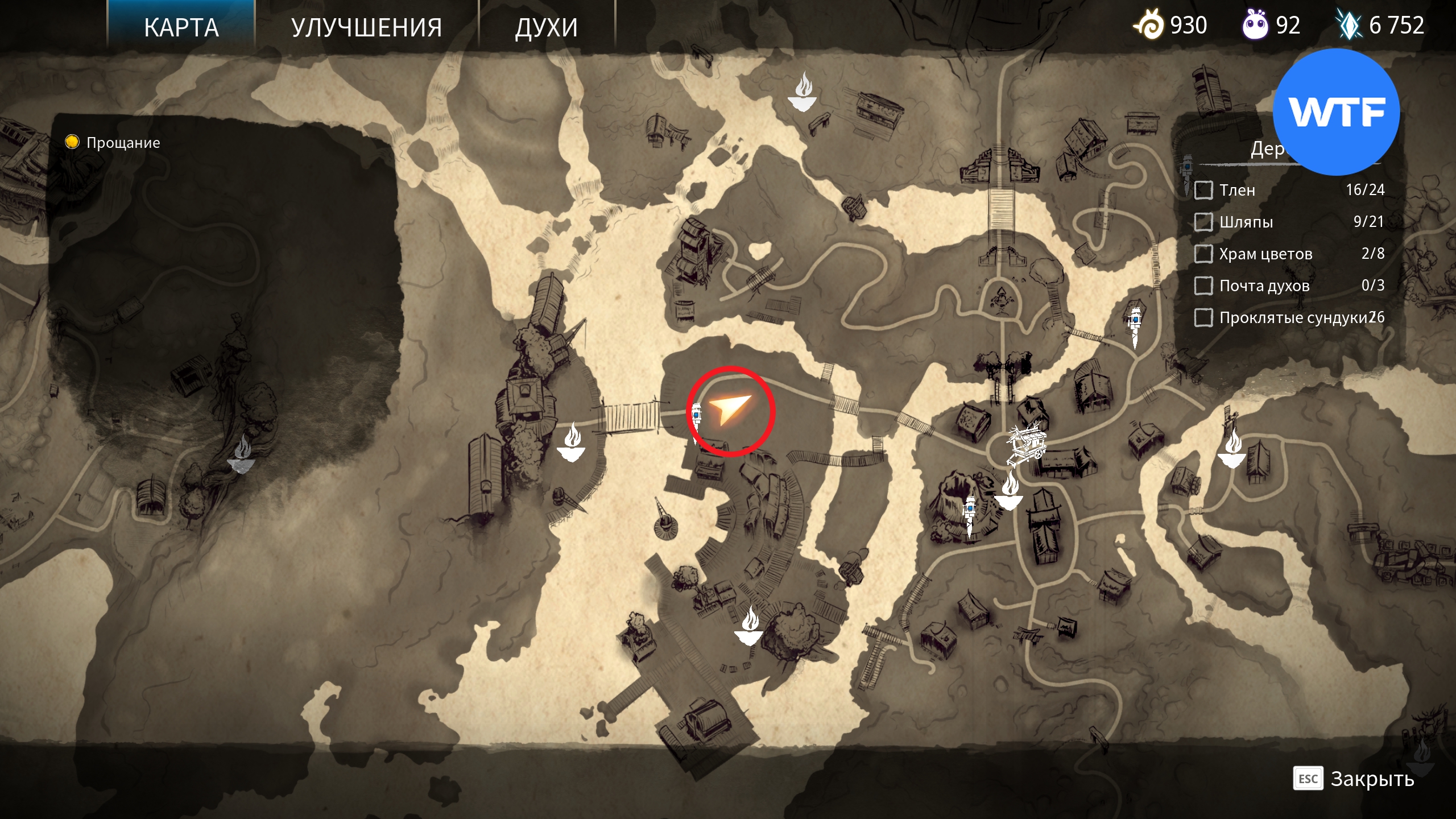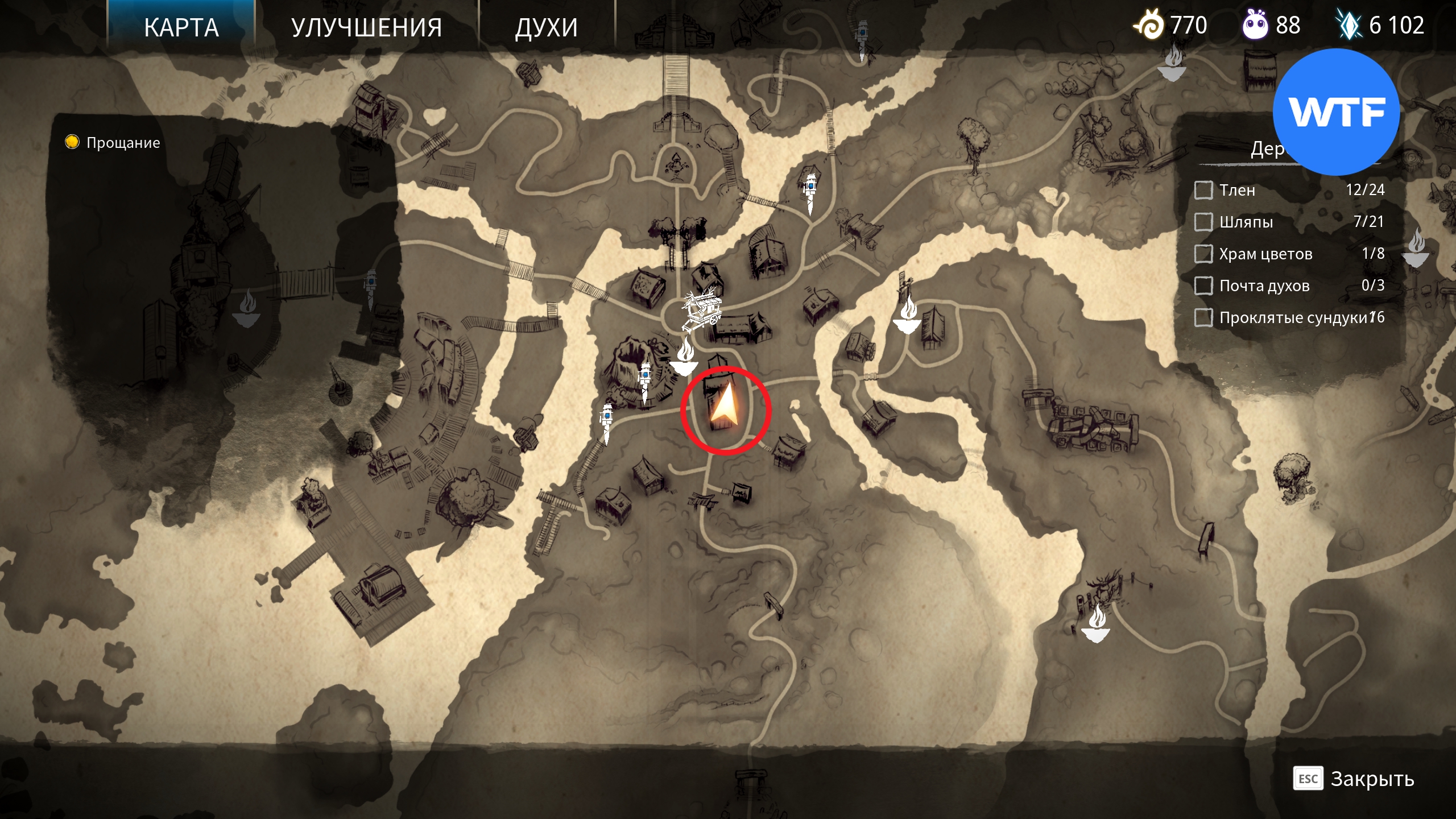 Отправляйтесь к самой южной отметке почты духов. Откройте область, очистите её от скверны, а затем зайдите в дом, отмеченный на карте ниже. Внутри есть сундук с этой шляпой.