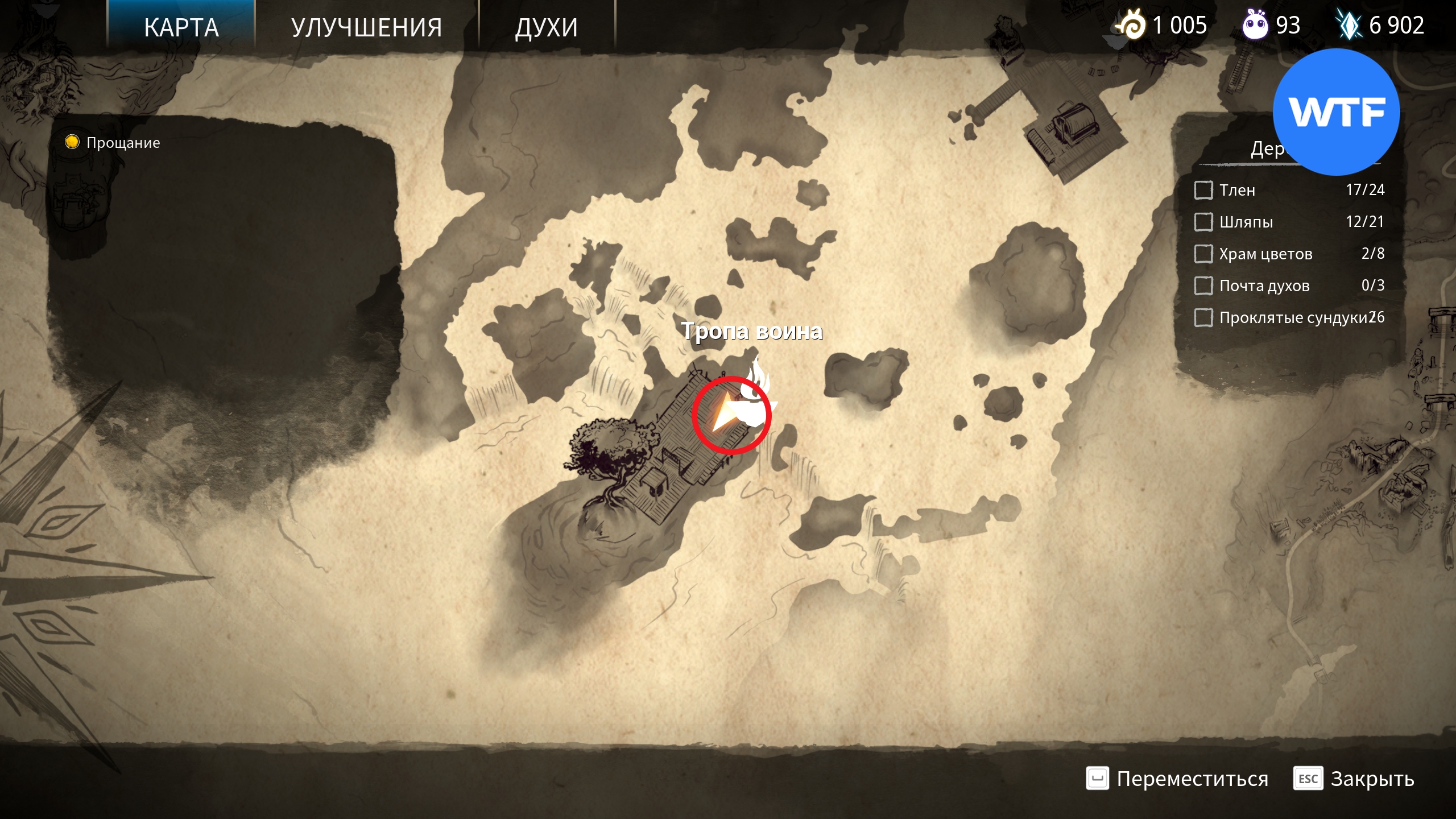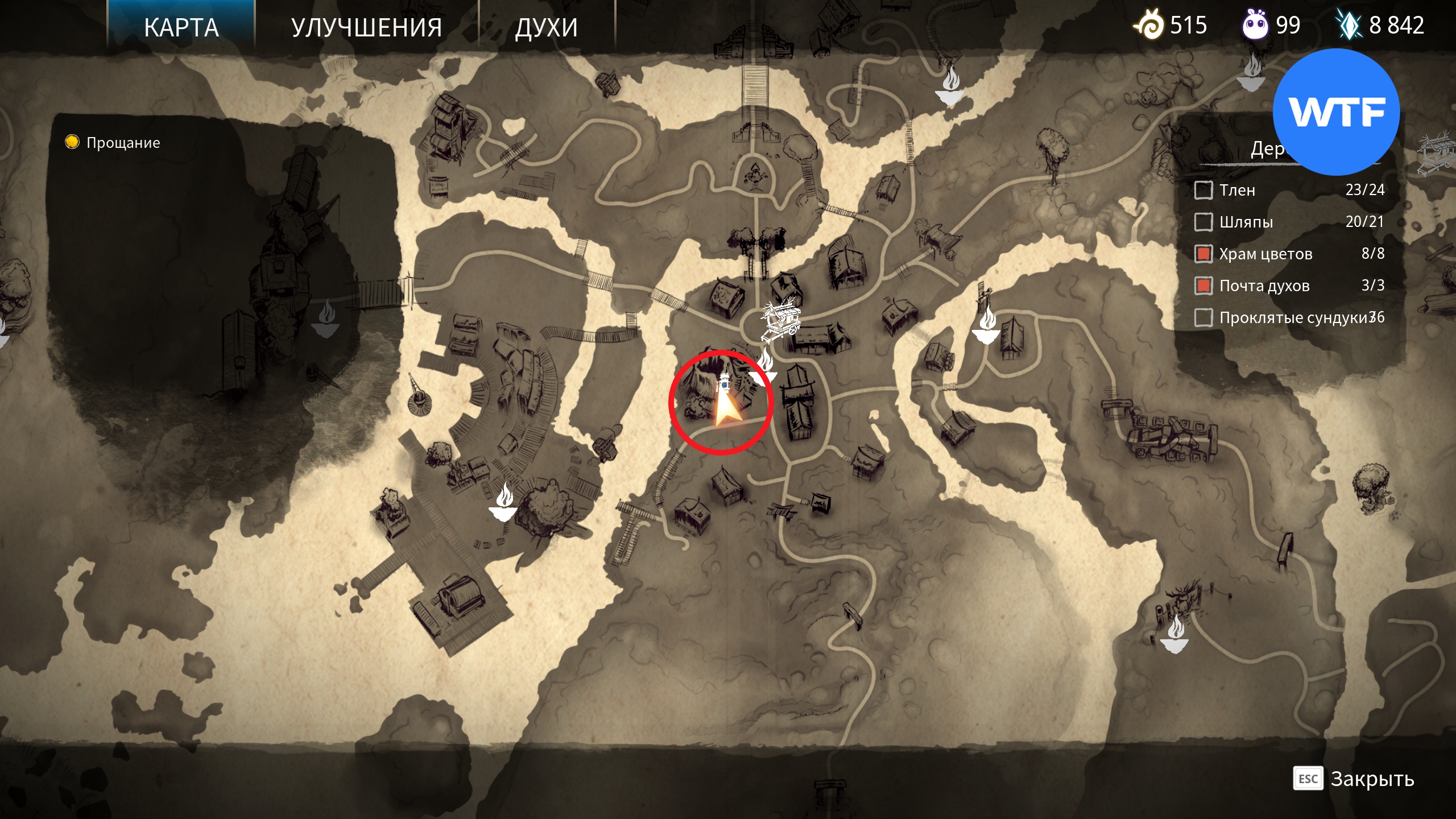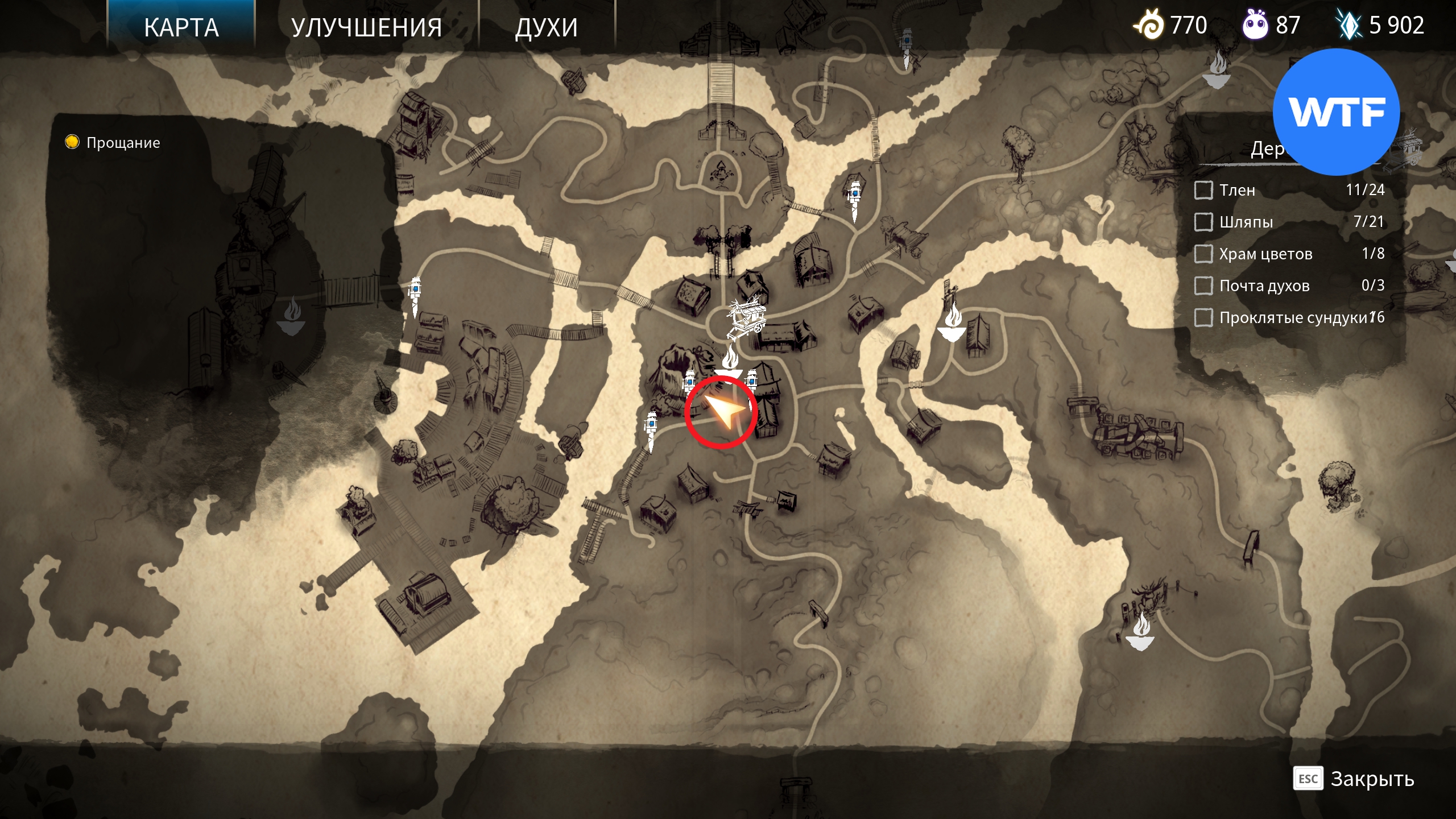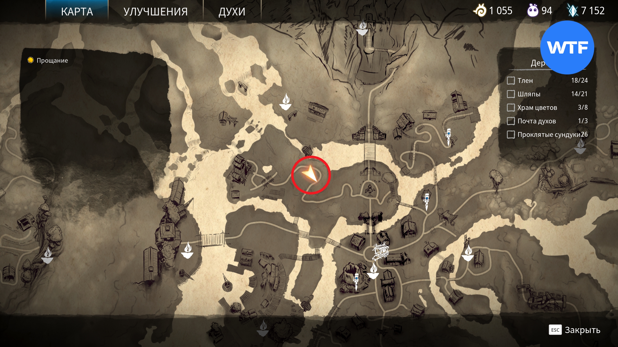 Отправляйтесь к самой южной отметке почты духов. Откройте область, очистите её от скверны, а затем зайдите в дом, отмеченный на карте ниже. Внутри есть сундук с этой шляпой.