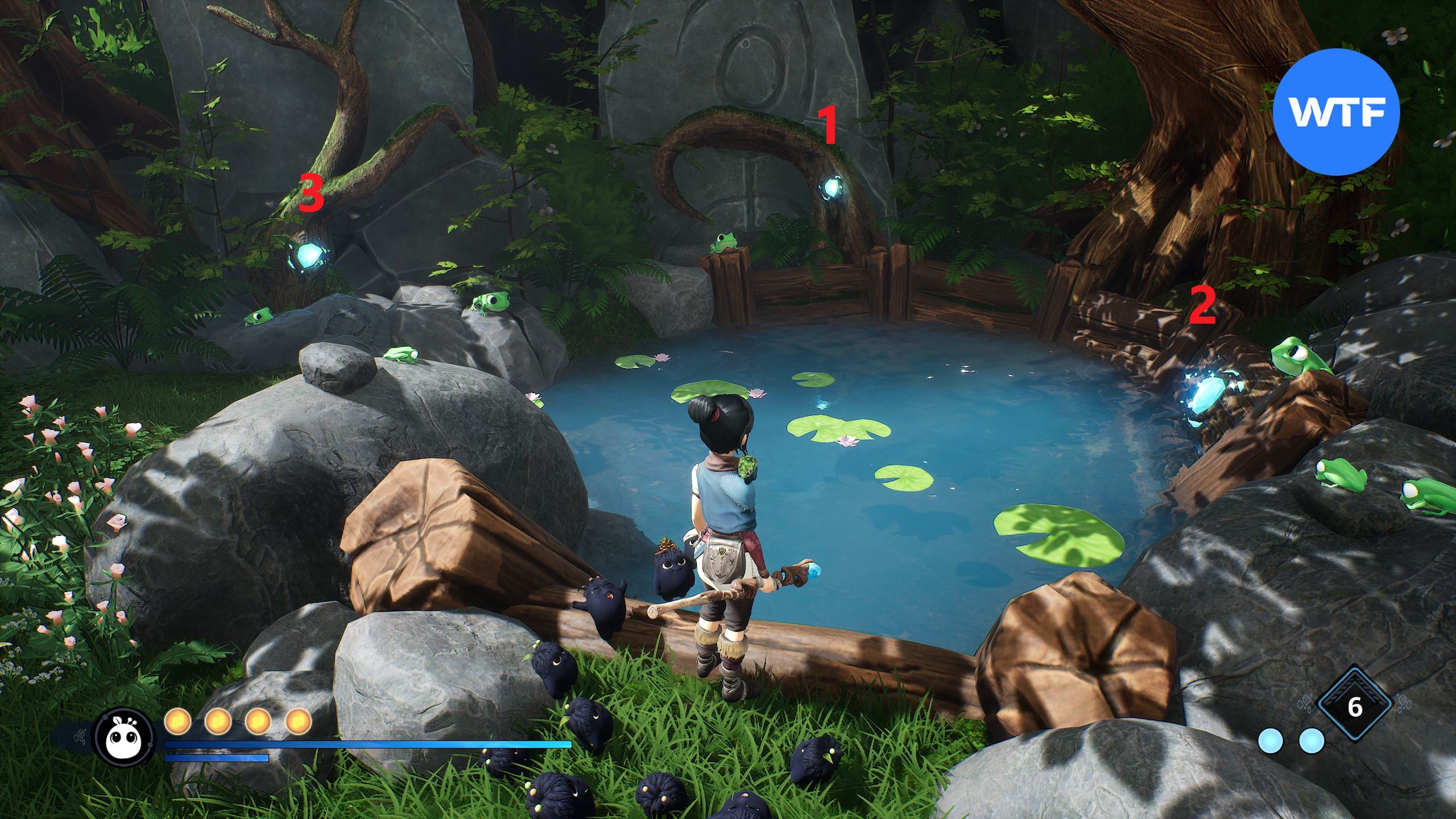 Теперь отправляйтесь к юго-западной отметке почты духов. После зачистки области там появится небольшой пруд. Лягушки в нем подскажут, в каком порядке стрелять по кристаллам (см. скриншот 2). Если все сделано правильно - появится тленыш.