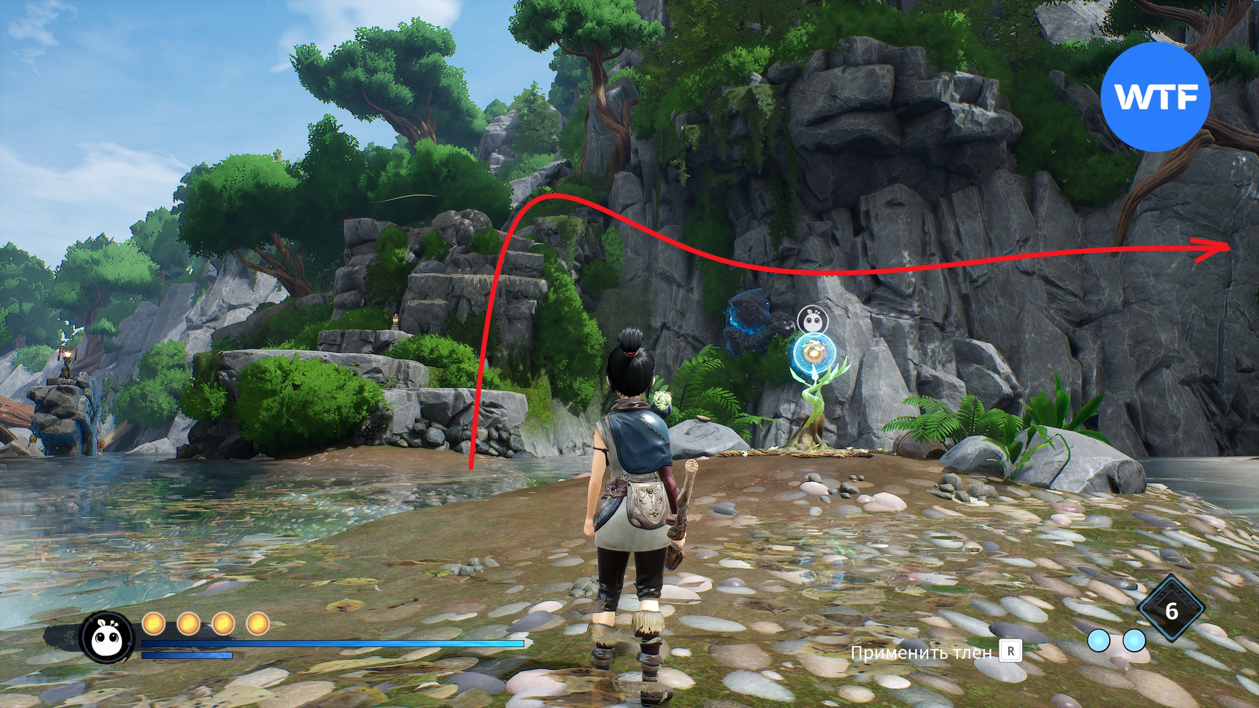 Доплывите до островка с Лесной слезой и развернитесь, чтобы увидеть уступы на берегу. Поднимитесь по ним наверх, затем киньте бомбу в камни и прыгайте по ним, пока не сможете выстрелить в синий цветок (см. скриншот 2).